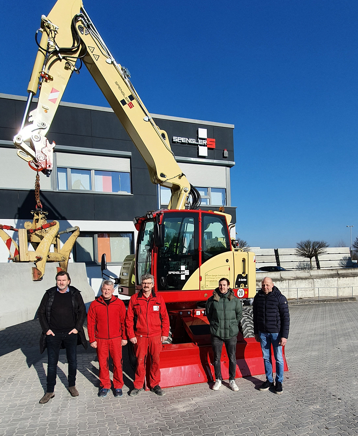 Da die Firma Spengler aber nicht nur produziert und liefert, sondern auch die Rückhaltesysteme selber aufstellt, sei die Herausforderung an die Maschinentechnik groß und mit den Anforderungen auf den Baustellen weiter gewachsen. In mittlerweile vierter Generation unterstützt Florian Spengler seine Eltern in der Geschäftsführung des Familienunternehmens und berichtet dem Baumaschinenhändler Engelhardt aus dem benachbarten Schopfloch von den Ansprüchen, die an eine Maschine gestellt werden, die auf den Baustellen unterstützen soll. „Die Baustellen werden für uns immer beengter, zumal wir oft auch bei weiter laufendem und fließendem Verkehr arbeiten müssen. Gleichzeitig werden aber auch die Bauelemente immer länger und damit auch schwerer.“ Die Herausforderung sei also eine Maschine zu finden, die kompakt und gleichzeitig kräftig ist, aber zusätzlich auch über eine große Reichweite verfügt. Erich Engelhardt gilt in der Region nicht nur als technisch äußerst erfahrener Fachmann, sondern hat mit seinem vorbildlich ausgestatteten Unternehmen einen exzellenten Ruf, wenn es darum geht, die passende Maschine für besondere Einsätze zu finden. Er verkauft Maschinen von Hyundai, Yanmar und eben auch von Hydrema und könne damit sofort die passende Antwort geben, denn natürlich sei für das Unternehmen Spengler ein Kettenbagger auf den Baustellen nicht einzusetzen.