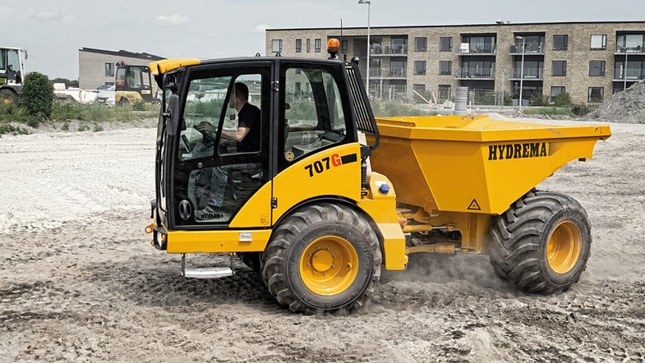 HYDREMA hat eine eigenständige Antwort entwickelt, auf das wahrgenommene Sicherheitsrisiko von den bislang eher als Maschine unterschätzen und daher oft sehr simple gebauten Baustellenkippern, die in der Klasse zwischen 500 und 9.000 Kilogramm Nutzlast den Materialtransport auf der Baustelle sichern sollen. Hierbei handelt es sich um Fahrzeuge, bei denen der Fahrer bisher immer hinter einer doch zum Teil großen Mulde gesessen hat, wobei der Fahrer bautechnisch gezwungen war, sein Fahrzeug nahezu blind zu fahren. Man stelle sich bergaufwärts führende Fahrten vor, wo sich das Volumen der Mulde samt Inhalt dem Fahrer entgegenstellt und dann erst Recht keine Sicht mehr für mögliche Hindernisse vor dem Fahrzeug gegeben ist. „In England hat es aufgrund einer Reihe von tödlichen Unfällen eine Untersuchung gegeben mit dem Ergebnis, dass Maschinen mit dieser Bauart von den Baustellen verbannt worden sind. Neben der schlechten Sicht war auch der hohe Schwerpunkt ein festgestellter Gefahrenpunkt. Unsere Lösung verfolgt daher das Prinzip des traditionell gebauten Muldenkippers“, erzählt der Vertriebsfachmann von HYDREMA.