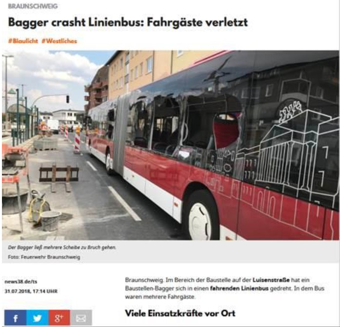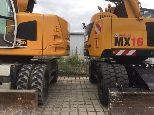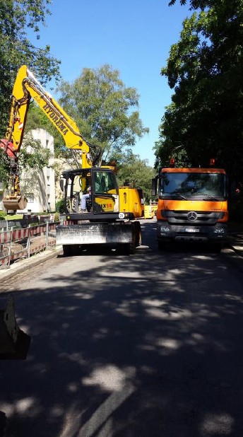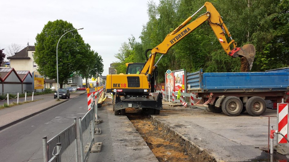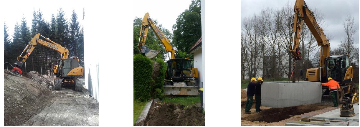 Gleichzeitig soll der Bagger aber eine große Reichweite und viel Kraft zum Heben von Lasten haben. Wenn er dann schwenkt soll nach Möglichkeit der Vorteil, der sich durch den kurzen Hecküberstand ergibt, nicht durch einen größeren vorderen Schwenkradius wieder verloren gehen. Gerade in der eng bebauten City gibt es hier immer wieder Baustellen, wo nur das kurze Heck alleine nicht ausreichend ist. Oft muss der Bagger auch über den Kabelgraben fahren, den er selber aushebt. Dann sind auch noch besondere Anforderungen an den Unterwagen gestellt, denn nur mit einer breiten Achse kann der Graben sicher überfahren werden, da sich so der Druck auf den Boden nicht direkt am Grabenrand auswirkt.