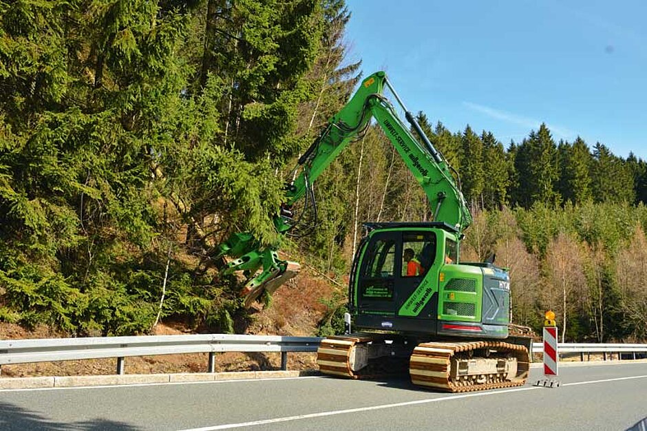 Die Landesstraße musste im Auftrag der Forstverwaltung freigeschnitten werden, die Fichten mit Stammdurchmessern bis 25 cm waren schonend und schnell zu fällen und abzulegen – bei laufendem Verkehr mit der Sperrung von nur einer Fahrspur. »Der Kurzheckbagger ist dazu das geeignete Werkzeug«, so Nico Willgeroth. »Wir arbeiten damit schnell, kommen nicht in den Gegenverkehr und die Maschine steht sehr sicher auch bei großen Ausladungen. Die drei Funktionen Klammern, Baumschneiden und Kippen/Anlegen des Baumes bewerkstelligen wir mit zwei Hydraulikkreisen. Einer ist per Knopf auf dem Joystick umschaltbar.« Reinhold Degelmann, der Willgeroth seit Jahren mit Unimogs beliefert, hat das Hyundai-Programm 2016 zusätzlich aufgenommen und bietet seinen Kunden nun auch Radlader, Mobil- und Kettenbagger an. Sein Unternehmen KLMV mit Sitz in Oberkotzau bei Hof und Niederlassung in Rodewisch betreut Teile von Ostbayern und das Vogtland.