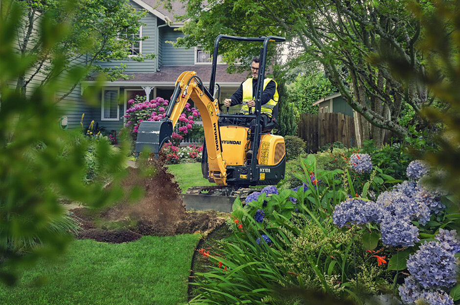 Mit der Einführung des HX10A ist Hyundai erstmals auf dem Mikrobaggermarkt vertreten. Dank seiner geringen Breite lässt sich die Neuheit etwa auf Pkw-gezogenen Tandemanhängern transportieren. Er passt durch schmale Türen, was den Betrieb im Gebäudeinneren vereinfacht. Der Monoblock-Ausleger ist schwenkbar, was dem HX10A ermöglicht, Grabarbeiten an einer Wand entlang auszuführen wie beispielsweise im Kanal- und Leitungsbau. Den Heckschwenkradius gibt Hyundai mit 747 mm an. Mit seinem Betriebsgewicht von 1 000 kg und großen Hub- und Losbrechkräften eignet sich der Minibagger für Einsätze im GaLaBau, auf Baustellen in Wohngebieten, für Abbrucharbeiten und für den Einsatz in Innenbereichen.