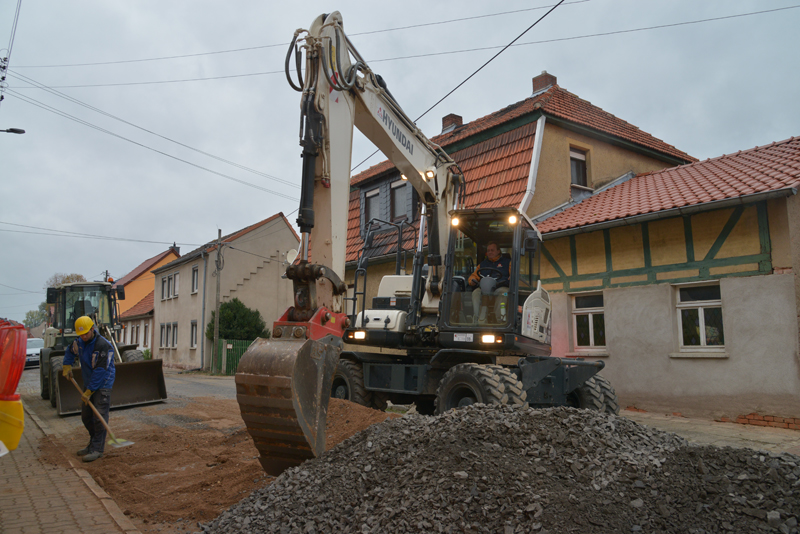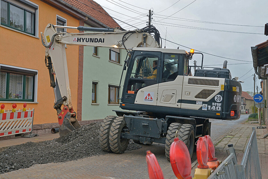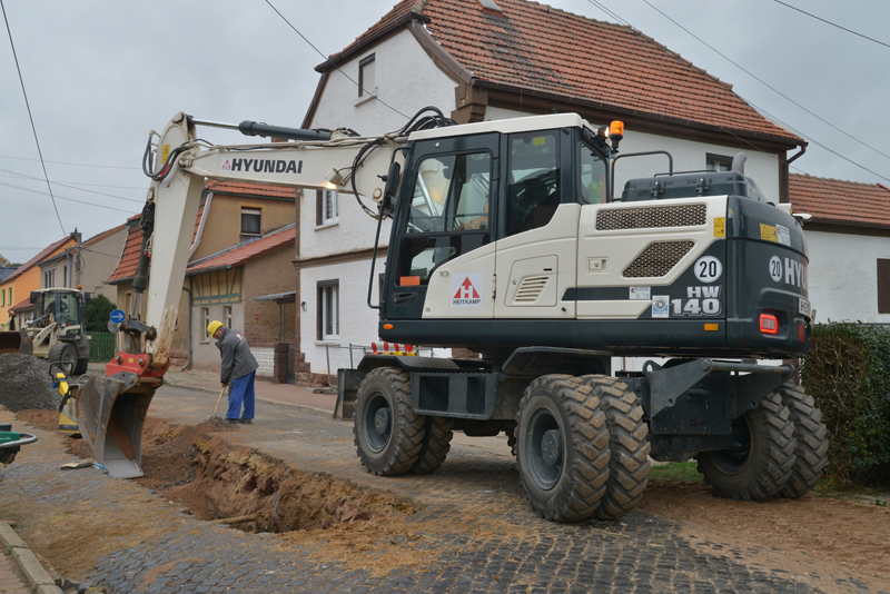 Eine typische Baustelle ist die Kanalsanierung mehrerer Straßenzüge in Rottleben im Kyffhäuser Land. Dort werden die Trinkwasserleitungen in 1,6 m Tiefe erneuert und gegen neue haltbare Kunststoffleitungen ausgetauscht. Weiterhin wurde der Mischwasserkanal DN 300 erneuert. Aufgabe der Hyundai-Mobilbagger HW140 ist das Freilegen der Rohrleitungen, die Verladung des Ausbaumaterials, das Einheben von Rohren und Baugeräten sowie das Verfüllen der Gräben mit Aushubmaterial und Schotter nach der Rohrverlegung.