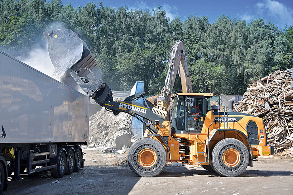 Johann Hartmeier jun., der unter anderem für den Fuhrpark aus 20 Bau- und Umschlaggeräten sowie 80 Lkw verantwortlich ist, hat sich Anfang dieses Jahres für den Hyundai-Radlader HL960A als Stufe V-Maschine wegen der Leistung, Verbrauch und Ergonomie entschieden. Auch der hervorragende schnelle Service des Hyundai-Vertriebspartners Fischer u. Schweiger aus Zusmarshausen bei Augsburg habe, so Hartmeier jun., einen wichtigen Ausschlag zum Kauf gegeben. Als Ausstattungsbesonderheit verfügt der Hyundai-Radlader über Vollgummireifen, die das problemlose Arbeiten im oft scharfkantigen Recycling-Material erleichtern. Die Hochkippschaufel wird notwendig, weil Hochbord- und Walkingfloor-Sattelzüge zu beladen sind. Die Auskipphöhe mit Hochkippschaufel erreicht 4,2 m.