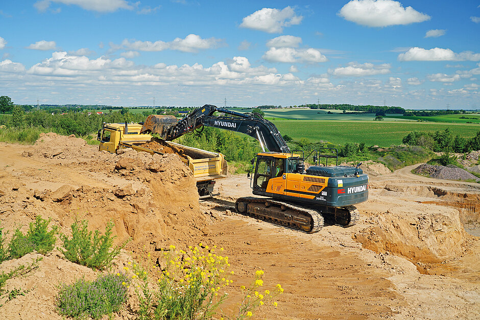 Persönlich betreut wird der Kunde von Petra Völker, Vertriebsmitarbeiterin beim HCEE-Vertragshändler Tecklenborg in Leisnig. Gemeinsam mit Bernd Liefold werden die passenden Geräte für den schweren Einsatz in der Kiesgrube, zum Verladen und für das Beschicken der Siebanlagen ausgewählt. Dazu Bernd Liefold: »Wir haben gute Erfahrungen mit dem ersten Radlader HL770 von Hyundai gemacht – so wurden es immer mehr. Für den Abbau von Deckschichten benötigten wir einen leistungsstarken Kettenbagger, der in Zusammenarbeit mit unseren Knickdumpern Lehm abtragen muss. Da ist der HX300A NL das passende Großgerät.«