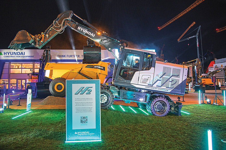 Feierlich wurde es, als HCE auch noch das Geheimnis um den neu konzipierten Mobilbagger HW155H lüftete – eine mit Wasserstoff-Brennstoffzelle ausgestattete Konzept-Maschine (das bauMAGAZIN berichtete in Heft 10/22, Seite 40), die gleich vor Ort ihr Können unter Beweis stellen durfte. Bei rund acht Stunden Einsatzdauer, so Hyundai, soll der 14 t schwere Bagger innerhalb von nur zehn Minuten wieder voll beladen sein. Im Gegensatz zum dieselbetriebenen Mobilbagger ist bei der Maschine mit Wasserstoffantrieb eine Brennstoffzelle im hinteren Teil des Oberwagens angebracht. Diese setzt die chemische Reaktion des gespeicherten Wasserstoffs mit Sauerstoff aus der Luft voraus. Aus dieser Reaktion erzeugt die Brennstoffzelle elektrische Energie, und ein Umrichter wandelt diese Energie in nutzbare elektrische Leistung um. Ein Elektromotor treibt dann die Hydraulikpumpe an, die wiederum die Maschine bewegt. Die einzige Emission des Brennstoffzellenstapels ist Wasser, eine Kombination aus Wasserstoff und Sauerstoff. Wenn dieser Wasserstoff mit erneuerbarer Energie wie beispielsweise von Offshore-Windparks erzeugt wird, führt dies zu einem Maschinenantrieb mit extrem niedriger CO₂-Bilanz.