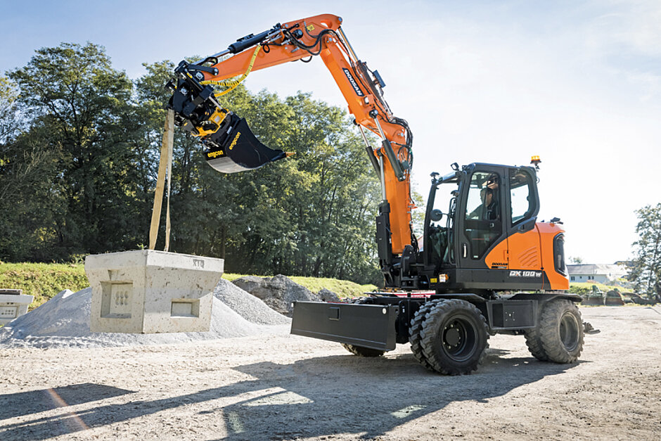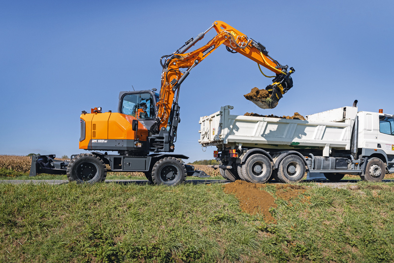 Dank Verstellausleger kann der Maschinenführer den Doosan-DX100W-7 zum Beladen so nah wie möglich an einen Lkw manövrieren. Zudem bietet der Bagger maximierte Hub- sowie Ausbrechkräfte und erfüllt mit einer Transporthöhe von weniger als 4 m auch eine in vielen Ländern existierende Vorgabe für Mobilbagger.