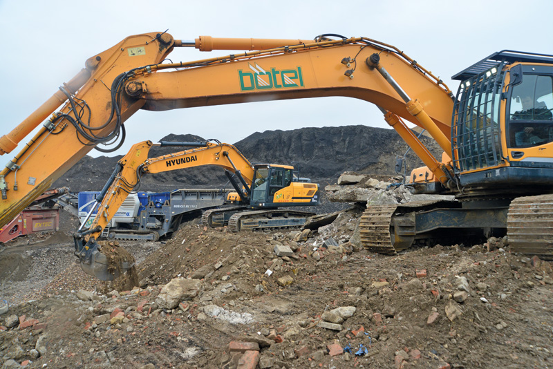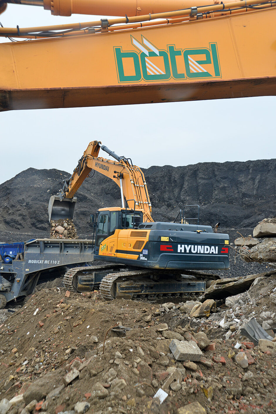 Letztgenannter ist seit Mitte Oktober letzten Jahres auf dem 15 000 m² großen Recycling-Platz im Braunschweiger Norden im Einsatz und beschickt primär Mobilbrecher mit Beton- und Ziegelaushub, der aus Rückbau- und Abbruchmaßnahmen im Raum Braunschweig stammt. Als Tagesleistung bei der Brecherbeschickung gibt Bötel für den HX 300 NLC bis zu 800 t für den mit einem 1,2 m³ fassenden Tieflöffel bestückten Hyundai HX300 an.