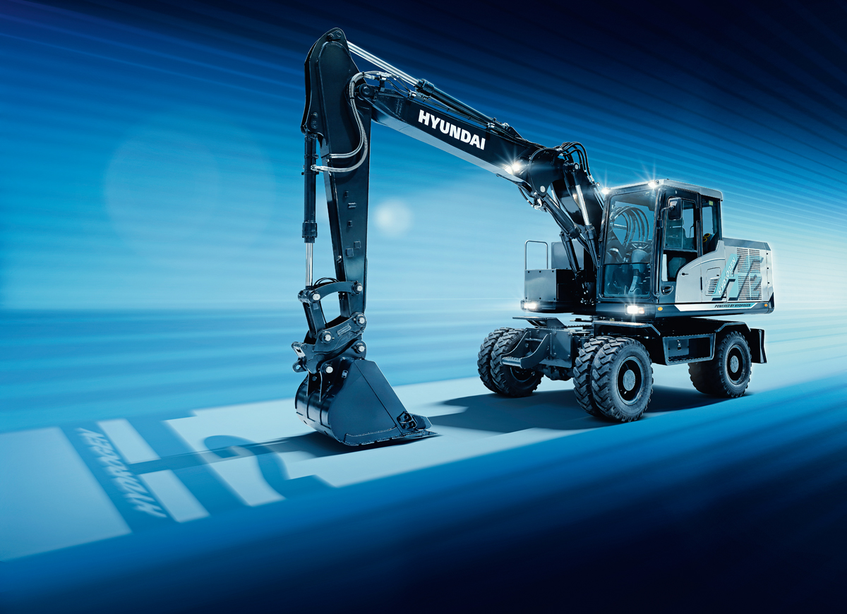 Der 14-Tonner HW155H bietet laut Hyundai acht Stunden Betriebszeit, die »Betankung« erfordert 20 Minuten. Anders als bei herkömmlich angetriebenen Mobilbaggern mit Dieselmotor und Hydraulikpumpe ist beim Wasserstoffbagger eine Brennstoffzelle im hinteren Teil des Aufbaus untergebracht, die elektrische Energie erzeugt. Diese wird zur Versorgung der Hydraulikpumpe genutzt, um die Maschine dann wie üblich zu betreiben.