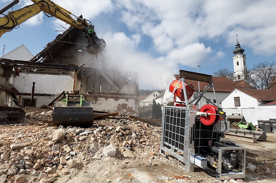 Der »Hurrikan«-Werfer ist mit einem integrierten Wassertank und Benzinmotor ausgestattet, wodurch er unabhängig von einer externen Infrastruktur betrieben werden kann. Mithilfe der Abbruchzange eines Baggers lässt sich das Gerät an beliebigen Standorten im Gelände abstellen. Die Bedienung erfolgt komfortabel über eine Fernsteuerung, mit der nicht nur Motorstart und Ein-/Ausschalten, sondern auch die vertikale und horizontale Ausrichtung des Werfers gesteuert werden können. Aufgrund der Flexibilität lässt sich der Wasserstrahl präzise auf die Staubquelle ausrichten. Zudem ist ein punktueller Betrieb möglich, wodurch der Wasserverbrauch laut Hersteller reduziert wird. Ein weiterer Vorteil: Durch den geringeren Wassereinsatz wird das Abbruchmaterial nicht unnötig durchfeuchtet, wodurch sich das Transportgewicht (Tonnage) und damit die Entsorgungskosten deutlich verringern.
