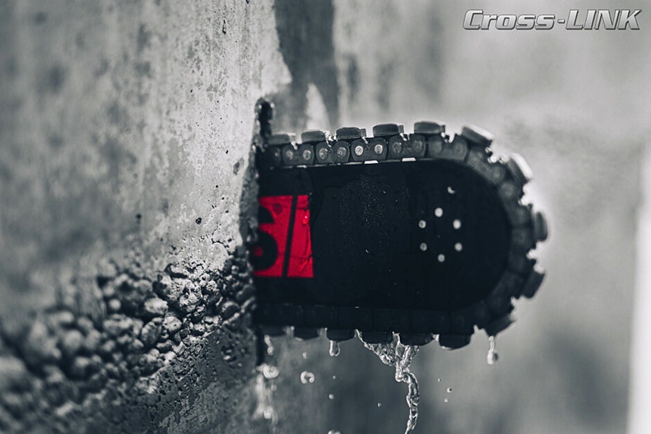 Wie ICS unterstreicht, schneidet die Force4 Cross-Link effizienter mit weniger Vorschub und zeigt sich dabei weitaus glatter als herkömmliche Diamantketten. Durch die zusätzliche Schnittstabilität soll die Kette symmetrische Verschleißmuster beibehalten, die gerade Schnitte während der gesamten Lebensdauer mit weniger Verschleiß an der Führungsschiene unterstützen. t