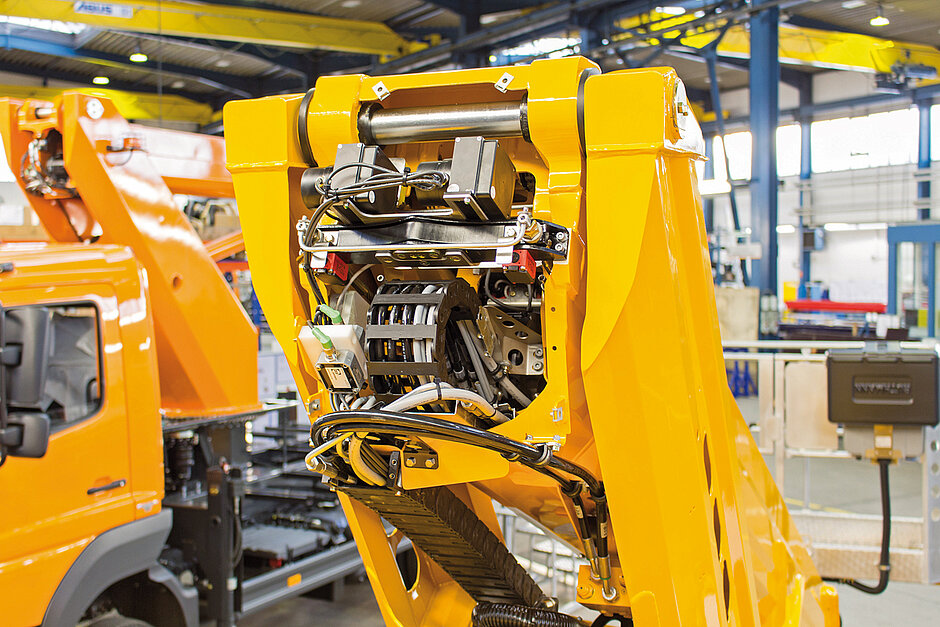Bei solchen Zahlen liegt es auf der Hand, dass möglichst kurze Durchlaufzeiten unbedingt erforderlich sind. »Wir haben hier im Grunde kein Lager, in dem die Fahrzeuge auf ihren Aufbau oder auch ihre Auslieferung warten«, beschreibt Nico Wessels, Leiter Produktkonstruktion, die Lage in Gescher-Hochmoor. »Wir setzen auf viele Gleichteile innerhalb der verschiedenen Baureihen.« Dies gilt auch für die Energiezuführung im Innern der beweglichen Teleskopausleger der Steiger. Hier setzt Ruthmann auf Energiekettensysteme vom »motion plastics«-Spezialisten igus und bezieht diese komplett vorkonfektioniert. Unter dem Namen »readychain« bietet igus diesen Komplettservice an und liefert die Module, bestehend aus »chainflex«-Leitungen und -Schläuchen für die direkte Montage. Je nach Kundenwunsch ist das zudem mit passenden Steckverbindern oder benötigten Metall-Anbauteilen möglich, was die Montagezeiten nochmals senkt.