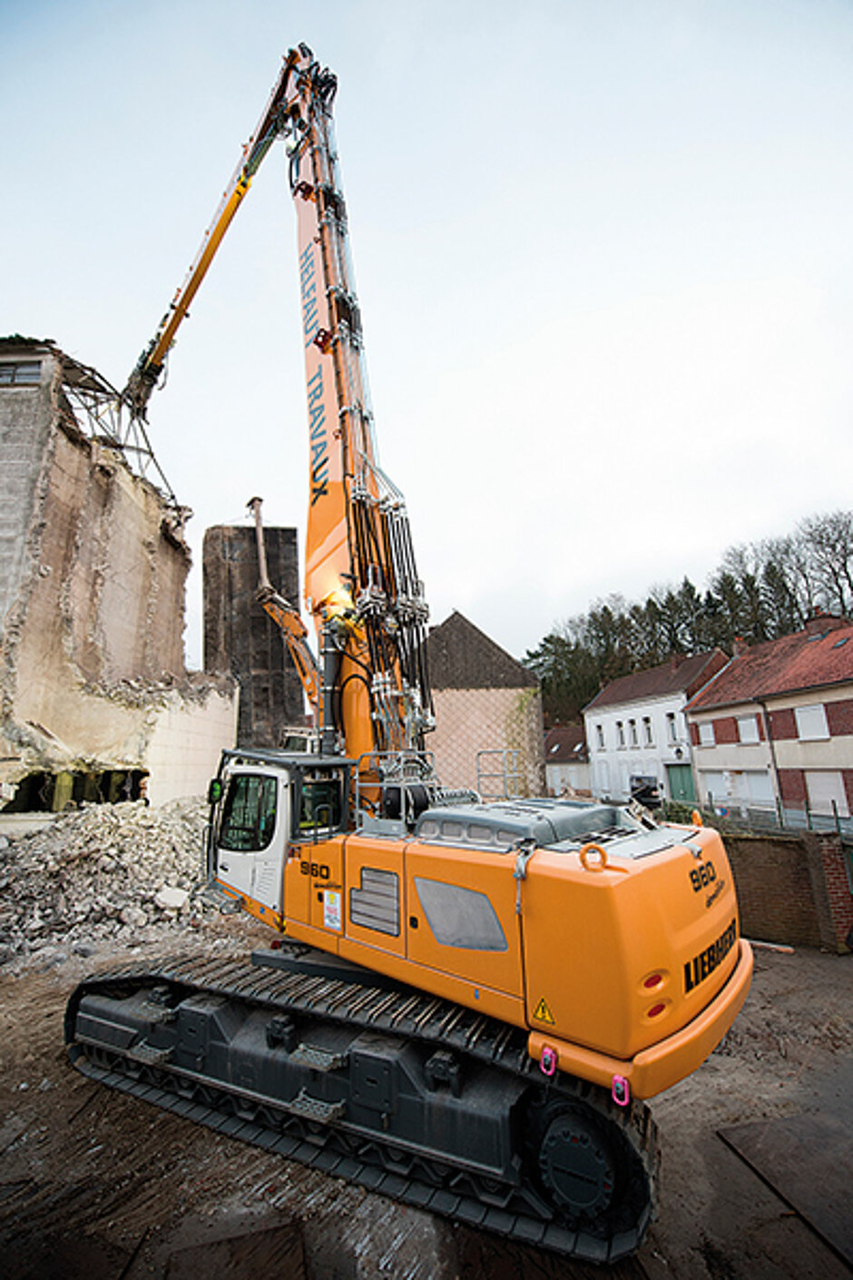 2014 erreichte der Abbruchraupenbagger, den die Firma Helfaut Travaux bislang besaß, nach mehrjährigem Einsatz und mehr als 9 000 Arbeitsstunden das Ende seiner Lebensdauer. Es wurde Zeit für eine neue Maschine, die der ehrgeizigen Geschäftsstrategie des Unternehmens gerecht werden konnte – der neue R 960 Abbruch. Für Pascal Cochet, Geschäftsführer von Helfaut Travaux, waren bei der Wahl vor allem die Qualität und die Kompetenz des lokalen Herstellers Liebherr ausschlaggebend: »Der R 960 Abbruch beruht auf dem Expertenwissen von Liebherr als Raupenbaggerhersteller, der über Know-how und langjährige Erfahrung in diesem Bereich verfügt.« Der alte Abbruchbagger von Helfaut Travaux mit großem Ausleger erreichte lediglich eine Abbruchhöhe von 28 m, während die des neuen Baggers bis zu 33 m beträgt. »Mit diesem Bagger brauchen wir auch keine Arbeitswerkzeuge in doppelter Ausführung, da diese sowohl mit kleinem als auch mit großem Ausleger eingesetzt werden können«, ergänzt Cochet.