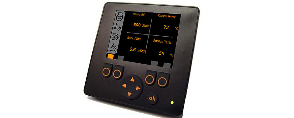 Der EngineMonitorPlus ist ein robuster Anzeige- und Überwachungsmonitor mit CAN-Bus-Schnittstelle, welcher speziell für den Einsatz an Industriemotoren konzipiert wurde. Hierfür werden die gängigen CAN-Botschaften nach dem SAE J1939 Standard unterstützt. Anzeigewerte wie z.B. aktuelle Motordrehzahl, Füllstände wie Adblue Level, Kühlflüssigkeitsstand, Temperaturwerte etc. können übersichtlich dargestellt werden.
