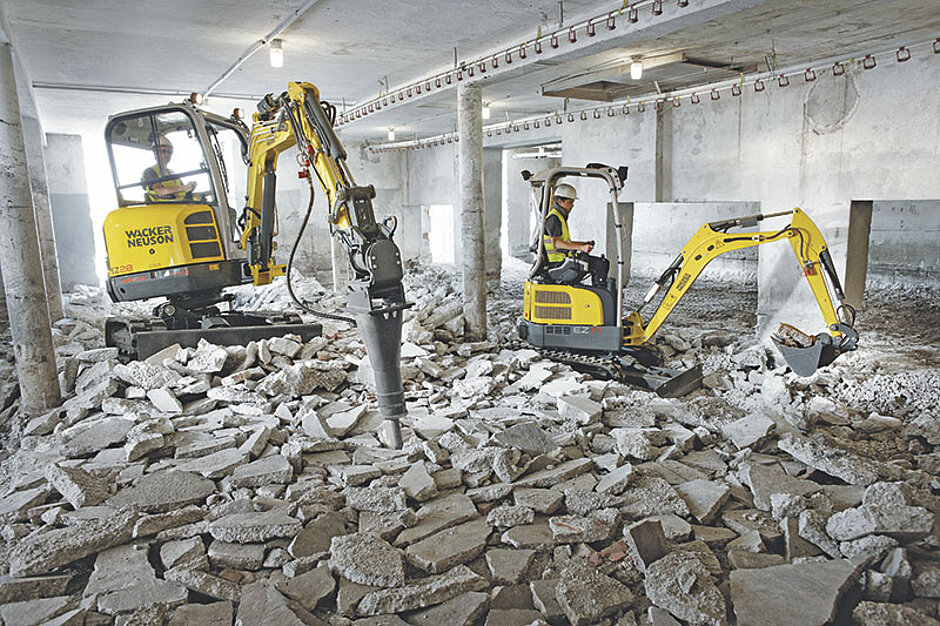 Die niedrige Höhe und der stark begrenzte Arbeitsbereich des 600 m² großen Hühnerstalls in Oberösterreich, der aufgrund seiner alten Bauweise erneuert wurde, waren die Schlüsselfaktoren für die Auswahl der Kompaktmaschinen für diese Baustelle. »Für die Innenabbrucharbeiten mit dem Hammer kam aufgrund des Platzmangels nur der Zero-Tail-Bagger EZ17 von Wacker Neuson in Frage. Dank seiner kompakten Abmessungen konnten wir die Arbeiten problemlos durchführen«, sagen Harald und Christian Zehetner, Eigentümer der Firma Zehetner Transporte-Erdbau. Die Arbeiten auf größeren Flächen und den Abtransport des Bauschutts übernahm aufgrund der höheren Umschlagsleistung das nächstgrößere Zero-Tail-Modell EZ28. Um im neuen Stall Raumhöhe zu gewinnen, trugen die beiden Maschinen nach den Innenabbrucharbeiten den Untergrund ab. Als Unterbau für die neue Bodenplatte wurden die Bagger genutzt, um Rollschotter aufzutragen und die richtige Höhe zu nivellieren.EZ17