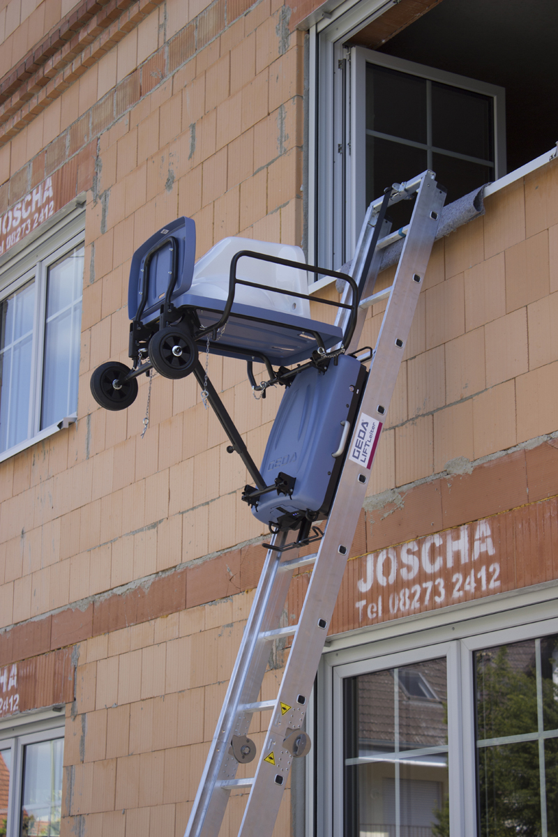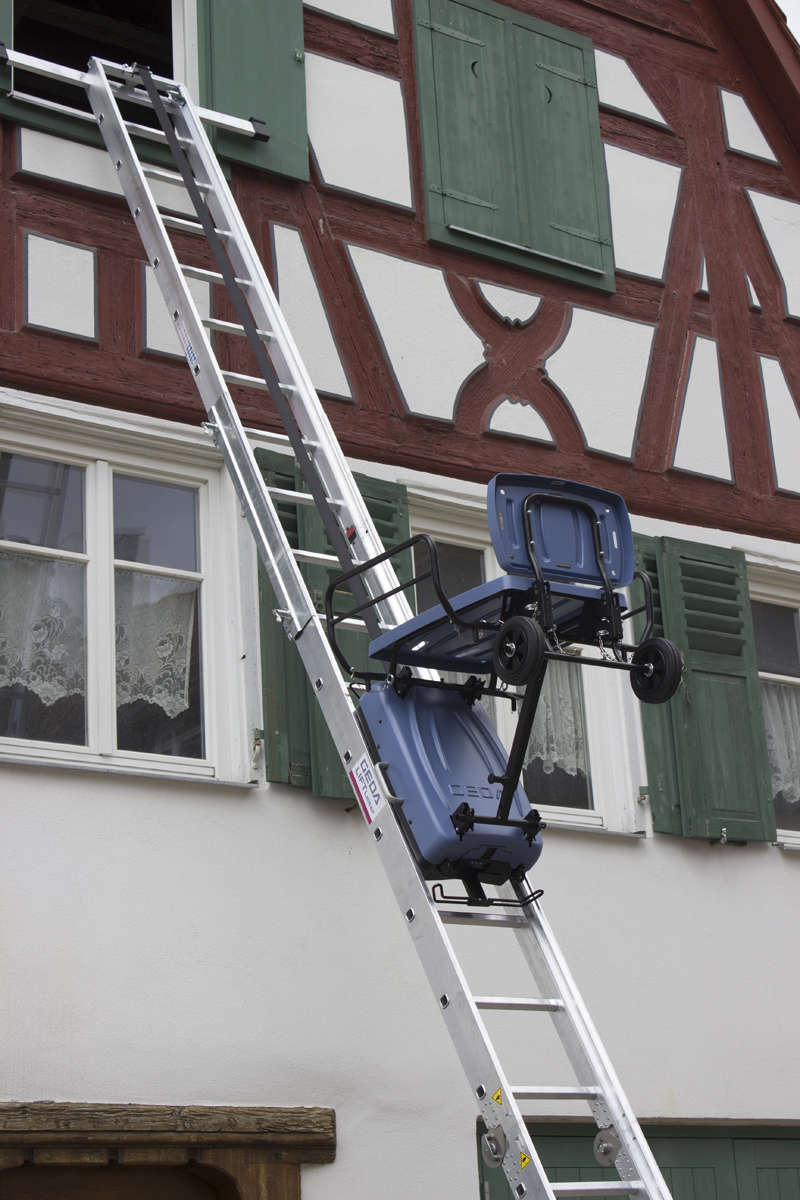 Der AkkuLeiterLIFT ist eine im Aufbau schnelle und pfiffige Lösung zum Höhentransport von Lasten bis 120 kg in 10 m Höhe, die auf einer speziellen Trittleiter verfahren kann und akkubetrieben ist.