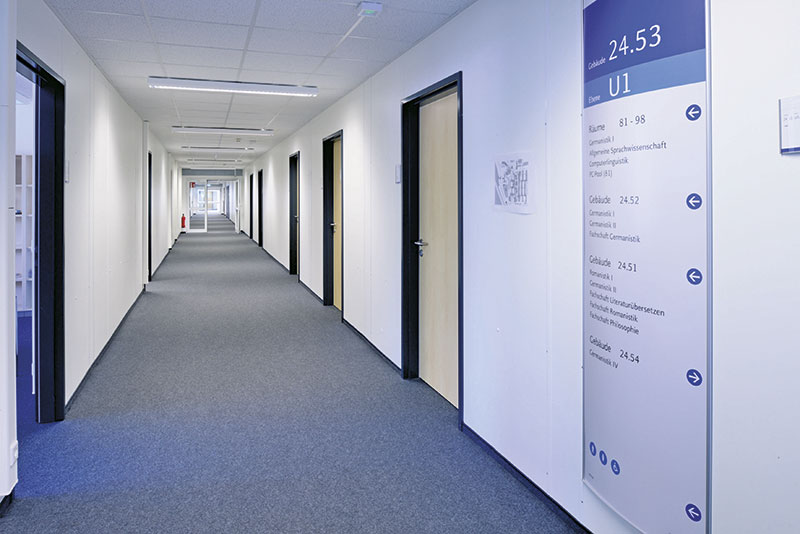 Das Interimsgebäude für die Philosophische Fakultät besteht inzwischen aus vier verbundenen Gebäudeteilen mit je drei Geschossen und 6 000 m² Gesamtbruttogrundfläche. Es beherbergt Büros, Seminarräume, Sanitäranlagen, Küchen und weitere Räume. Durch die moderne Optik mit hochwertiger Kassettenfassade integriert sich der neue Gebäudekomplex harmonisch in die Architektur des Campus und macht ihn zu mehr als einem Provisorium. Die Hochschule bleibt mit der Anmietung der FAGSI-Systemgebäude flexibel, denn gemietet wird – wie in diesem Beispiel – nur während der Gebäudesanierung. Besteht der Raumbedarf nicht mehr, wird der Mietvertrag mit kurzen Fristen gekündigt. Das temporäre Gebäude lässt sich danach schnell und rückstandslos rückbauen oder an einen anderen Ort versetzen.
