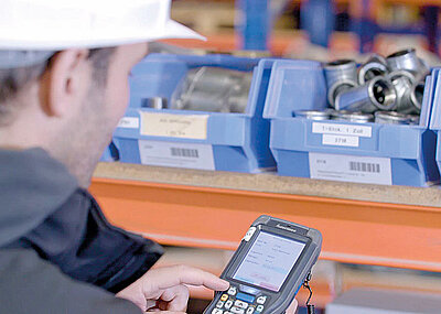 Ein großer Teil der Scans betrifft die Entnahme von Ersatzteilen aus dem Lager, die im Zuge von Reparaturen von den Monteuren angefordert werden. Hier kommt das Softwaremodul »Werkstattbericht« zum Einsatz. Der Lagerist gibt am Handheld die Materialien ein, die für den jeweiligen Auftrag kommissioniert werden müssen. Danach entnimmt er die Artikel aus den Regalfächern und quittiert jeden Vorgang mit einem Scan des dort angebrachten Barcodes. Auf gleiche Weise funktioniert das Softwaremodul »Ausgangslieferschein«: Es wird eingesetzt, wenn zum Beispiel ein Bauleiter Filtermasken für seine Mitarbeiter benötigt. Das Modul »Bestellvorschlag« startet hingegen einen Beschaffungsprozess. Es wird immer dann aktiviert, wenn die Lageristen ein leeres oder fast leeres Regalfach sehen. In diesem Fall wird der Barcode am Regalfach gescannt und eine Bestellmenge eingegeben. Der Vorschlag wird an das ERP-System übertragen und einem Sachbearbeiter im Einkauf angezeigt. Dieser entscheidet, ob die Bestellung tatsächlich ausgelöst wird.