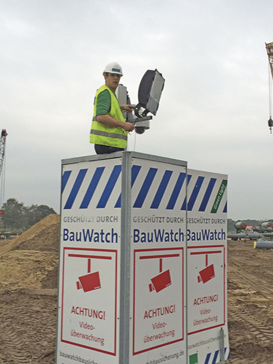Ein Anruf genügt und BauWatch sorgt dafür, dass die Baustelle am nächsten Tag geschützt ist. Das System ist innerhalb einer Stunde betriebsbereit und eignet sich für kurzfristige, aber auch für langfristige Arbeiten. Einzig ein 220-V-Stromanschluss wird bei einem Standardgerät benötigt. Wird die Stromversorgung unterbrochen, schaltet das System bis 72 Stunden auf Akku-Betrieb. In der Meldezentrale wird ein Alarm ausgelöst, der Sicherheitsdienst informiert und entsprechende Maßnahmen werden eingeleitet. Bei eindeutigem Fehlalarm wird der Auftraggeber informiert und aufgefordert die Stromversorgung wieder herzustellen. Ist ein Stromanschluss bauseits nicht möglich, kann ein Gerät mit einer kombinierten Energieversorgung mittels Brennstoffzelle und Solar ausgestattet werden. So kann das System autark und ohne Wartung rund sechs Monate eingesetzt werden. Die BauWatch-Baustellenleuchten verfügen über Dämmerungsschalter. Bei beginnender Dunkelheit schalten sich die Leuchten abends ein und morgens bei entsprechender Helligkeit wieder aus. Der Bau- oder Lagerplatz ist dann entsprechend ausgeleuchtet. Neuerdings werden stromsparende LED-Strahler eingesetzt. Ein grünes Licht sorgt zusätzlich für bessere Nachtsichtbarkeit. Die Technik wie Dome-Kamera, Router, GPS-Ortung, Steuerung sowie Hardware ist für den harten Baustelleneinsatz konzipiert. Die robuste Ausführung mit einem Gesamtgewicht von über 500 kg ist vor Diebstahl und Vandalismus geschützt.