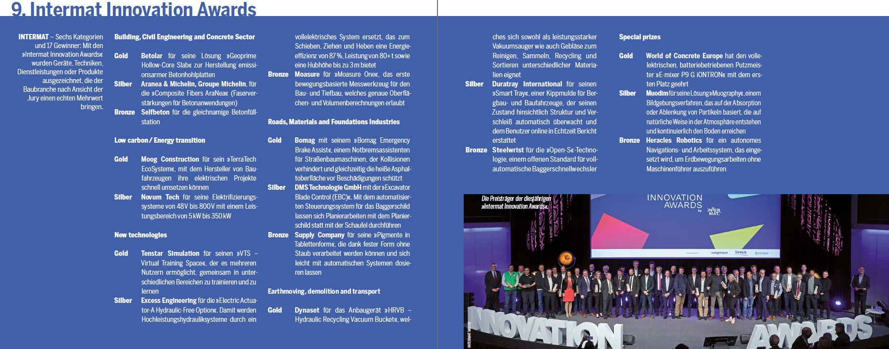 Beim Gang durch die Messehallen und über den Outdoor-Bereich fiel auf, dass das »Who is who« der internationalen Bauunternehmen zu finden war. Am stärksten vertreten waren Anbieter aus Belgien, den Niederlanden, Italien, Deutschland, dem Vereinigten Königreich, Finnland, den Maghreb-Staaten und der Türkei. Zwar waren am ersten Tag das Wetter – und wohl deswegen auch die Stimmung unter den Ausstellern – etwas getrübt, dafür hellte sich beides am zweiten Tag deutlich auf. Insbesondere der Außenbereich war spürbar belebter. Für Stimmung sorgten auch die »Intermat Innovation Awards«, die an 17 Aussteller und deren Produkte verliehen wurden (siehe Kasten). Der Messebereich »Neue Technologien & Energien« feierte auf der Intermat sein Debüt und zeigte ebenso wie das »Start-up-Village« Technologien und Ausrüstungen, die neue, alternative oder erneuerbare Energiequellen (Biokraftstoffe, Strom, Wasserstoff usw.) sowie virtuelle und digitale Technik, Lösungen zur Energiespeicherung oder autonome Fahrzeuge umfassten. Nach Angaben der Messe interessierten sich fast 50 % der Besucher für den Ausstellungsbereich und die Konferenzen, bei denen es um die Dekarbonisierung der Betonbranche ging.
