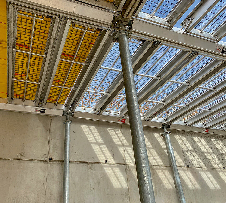 Zur Schalung der Decken setzt Züblin auf das HV-System von Ischebeck. Grundbauteile des Systems sind Haupt- und Nebenträger aus Aluminium, die in einen Fallkopf eingehängt werden, der sich auf alle üblichen Stützen montieren lässt. Der Fallkopf ermöglicht nach dem Betonieren ein früheres Ausschalen ohne Entlastung der Stützen. Einige Hammerschläge genügen, um ihn um 10 cm abzusenken. So stehen die Träger schnell wieder zum Einsatz im nächsten Schaltakt zur Verfügung und die Materialvorhaltung auf der Baustelle lässt sich verringern.