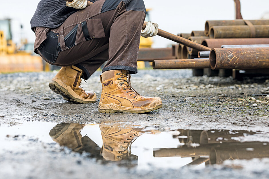 Um das Tragen der Sicherheitsschuhe mit einem Maximum an Komfort zu unterstützen, müssen S3-Sicherheitsschuhe für rutschige und unbefestigte Untergründe mit Extras ausgestattet sein. Exzellente Dämpfung und ein Grip, der sich an unterschiedlichste Bedingungen anpasst, sind grundlegend für angenehmen Tragekomfort. Die Sohle muss bei Regen, Schnee, in Schlamm, Geröll und auf dem Feld bestehen und verlässlichen Halt geben. Erreicht wird dies durch eine selbstreinigende Laufsohle mit Stollenprofil und breiten Flexkerben. Das Profil verhindert, dass sich Steine oder Dreck in den Kerben der Sohle festsetzen. Einige Modelle bieten zusätzlichen »Leitergrip«, der besonderen Halt und Sicherheit beim Besteigen von Leitern und Sprossen bietet. Einkerbungen in der Sohlenmitte und eine starke Absatzkante sorgen dabei für Rutschfestigkeit. Als Beispiele nennt ISM die Modelle »Scuff Caps Evo« von Puma Safety.