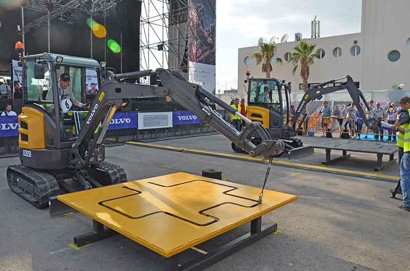 Mit einem Volvo-Dumper A30G hatten die Fahrer beispielsweise ihre Geschicklichkeit und Genauigkeit beim Rückwärtsrangieren unter Beweis zu stellen. Nur unter Verwendung des Baggerauslegers und des Löffels eines Volvo-Kurzheckbaggers ECR25D galt es für die Teilnehmer aber auch, einen kleinen Metallanhänger möglichst schnell und geschickt durch einen nur spaltbreiten Parcours zu bugsieren.