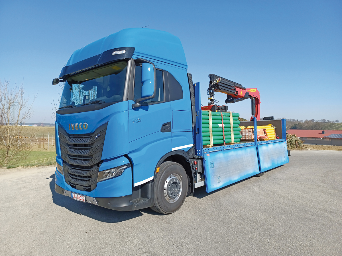 Der Iveco S-Way LNG mit Pritsche und Ladekran ist besonders auf die Anforderungen für das Baustofftransportgeschäft oder auf witterungsresistente Frachten zugeschnitten. Transporteure profitieren mit dem LNG-betriebenen Baustofffahrzeug nicht nur von einer erweiterten Einsatzflexibilität beim Transport von Gütern, sondern auch beispielsweise innerstädtisch vom Geräuschvorteil eines Gasmotors und deutlich geringeren Schadstoffemissionen.