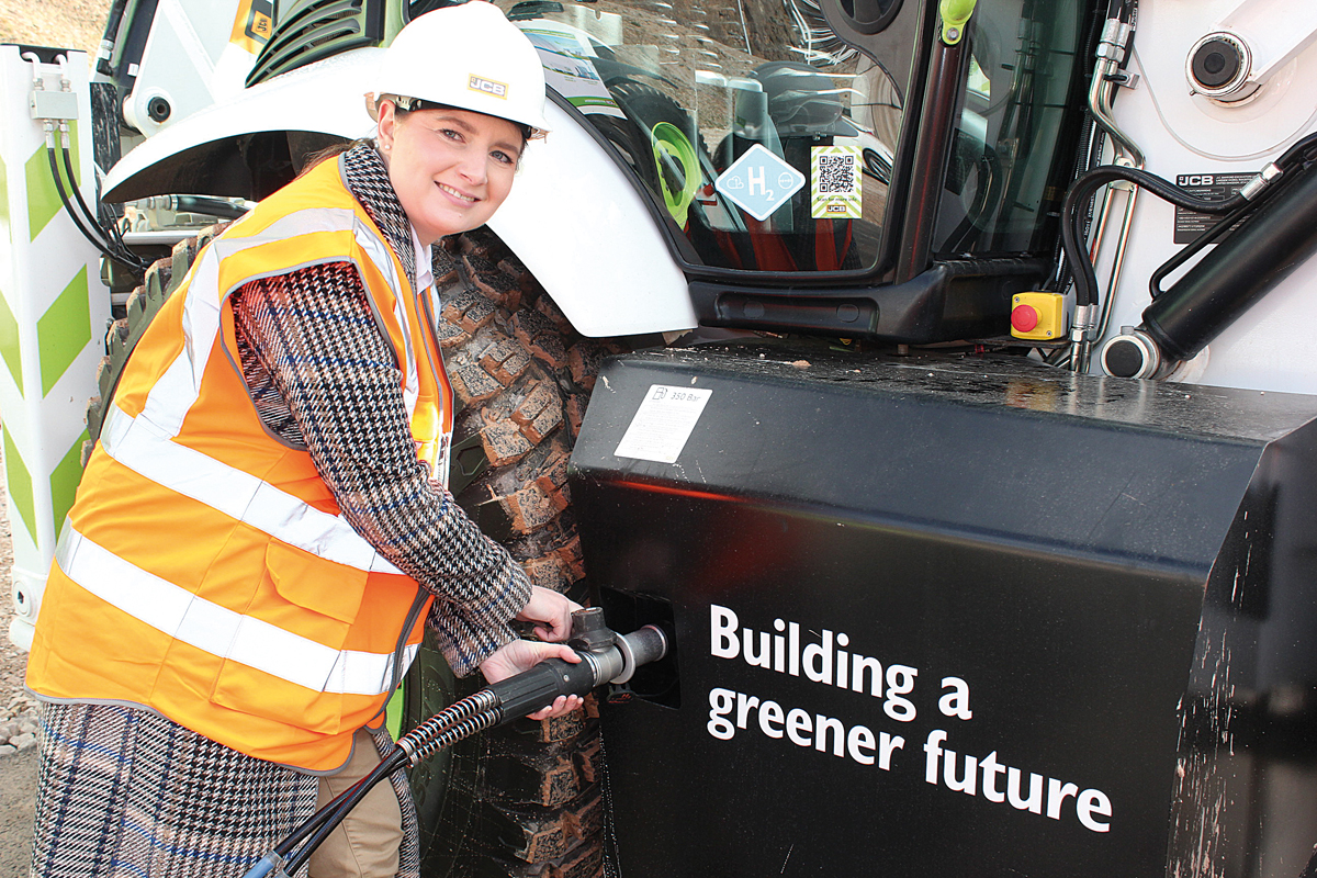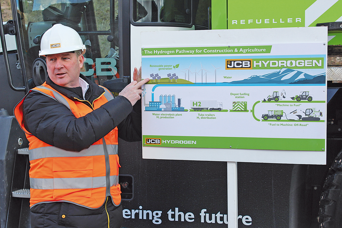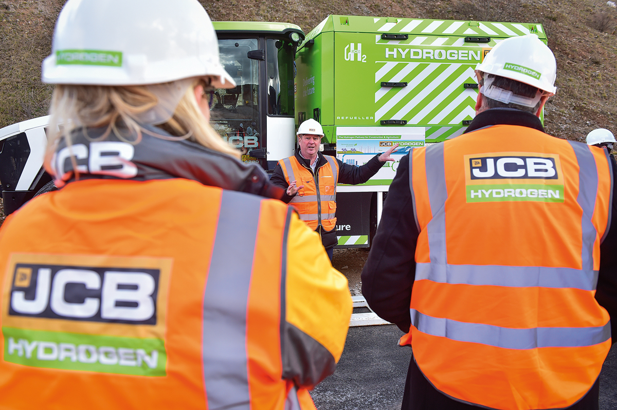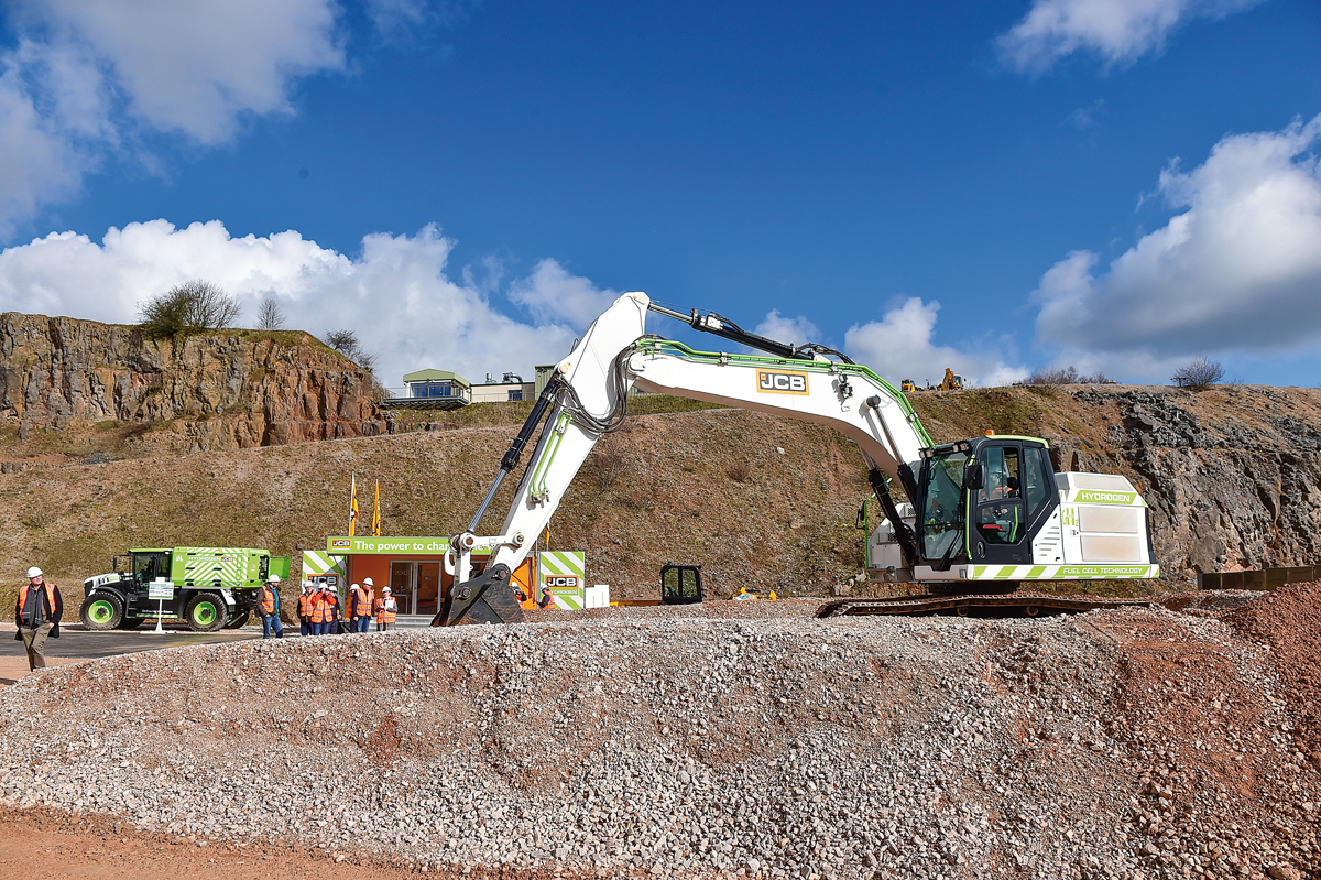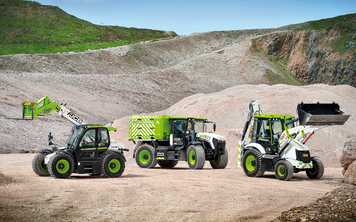 Dieses Optimum an Daten präsentieren die Briten im firmeneigenen Steinbruch in der Nähe von Rocester, dem Unternehmenssitz. Im lederbezogenen und kaum minder luxuriösen – im Vergleich zu JCB-6 –, dieselbetriebenen Neunsitzer inklusive Stern im Kühlergrill cruist die Journalisten-Truppe vorbei an steinummauerten Schafweiden und traditionellen Steinhäusern direkt hinab in die Schottergrube. Neben dem seit 2019 in Serie gefertigten Elektro-Minibagger 19C-1E warten dort drei Prototypen auf die Medienleute: ein via H₂-Brennstoffzelle betriebener 20-t-Koloss, Modell 220X, ein Baggerlader mit Wasserstoffmotor sowie eine eigens entwickelte und gebaute mobile Betankungsanlage, mit der der Wasserstoff zu den Maschinen gebracht werden kann. Dieser Tankwagen fasst genug Wasserstoff, um 16 H₂-Baggerlader zu betanken,1 und kann entweder auf der Rückseite eines modifizierten JCB-Fastrac oder auf einem Anhänger transportiert werden. »Eine mobile Kraftstofflösung, bei der der Kraftstoff zur Maschine gebracht werden kann, ermöglicht einen effizienten Betrieb für unseren Kunden«, ist sich Projektleiter Bamford sicher.