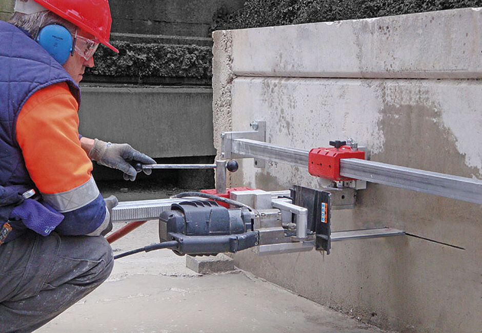 Der Anwender schaltet die Säge ein und die Softstartelektronik bringt die Kette auf die Leerlaufdrehzahl von 9 400 U/min. Beim Sägen drückt der Anwender das Schwert mit der laufenden Kette in das Material, die Drehzahl reduziert sich und die Leistungsaufnahme des Elektromotors steigt an. Bei einer Leistungsaufnahme von 4 600 W (ca. 6 PS) hat die Kette eine Lastdrehzahl von 6 150 U/min. Erhöht der Anwender den Anpressdruck oder klemmt die Kette, dann senkt die Multifunktionselektronik sofort die Stromaufnahme. In der Folge wird die Softstartelektronik aktiviert und wenn das Schwert mit Kette frei ist, dreht der Motor wieder auf die Leerlaufdrehzahl und der Anwender kann weiter arbeiten. So werden weniger geübte Anwender gezwungen, mit dem richtigen Anpressdruck und der richtigen Lastdrehzahl zu arbeiten. Ferner wird der Verschleiß von Kette und Schwert reduziert und ein Überlastungsschaden beim Motor vermieden.Der Anpressdruck spielt wie auch beim Diamantbohren eine wichtige Rolle. Ebenso muss beim Sägen ein gleichmäßiger Anpressdruck von einem bestimmten kg/cm²-Wert Segmentfläche erreicht werden, um einen guten Vorschub zu erzielen. Beim Einstechen in das Material sind drei bis vier Segmente im Einsatz und es ist für den Bediener leicht, den Anpressdruck aufzubringen. Bei einer Beton Materialstärke von ca. 35 cm sind ca. zehn Segmente im Material und benötigen daher den dreifachen Anpressdruck, den kein Anwender frei Hand aufbringen kann. Aus diesem Grund hat Cardi ein Führungssystem (ähnlich Bohrständer für das Kernbohren) für die Kettensäge entwickelt. Mit diesem System können maßgenaue Profiarbeiten mit einer Diamantkettensäge durchgeführt werden, die mit anderen Maschinen nicht ausführbar sind, beispielsweise eine Öffnung in den Maßen 20 x 30 cm.