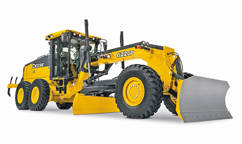Weil John Deere bei beiden Motorgradern auf eine offene Architektur setzt, können Kunden ihre bevorzugten Nivelliersysteme verwenden. Die GP-Modelle sind werkseitig mit Schottverbindern, Sensorhalterungen, elektrischen Kabelbäumen, integrierten Steuerungen und Masthalterungen für die Scharen ausgestattet. Alle GP-Modelle verfügen serienmäßig über eine automatisierte Querneigungswinkeleinstellung. Die Querneigungsfunktion vereinfacht das Halten einer gleichmäßigen Neigung, da der Bediener nur eine einzige Steuerung ausführt, während die Maschine die gegenüberliegende Seite des Schildes automatisch einstellt.