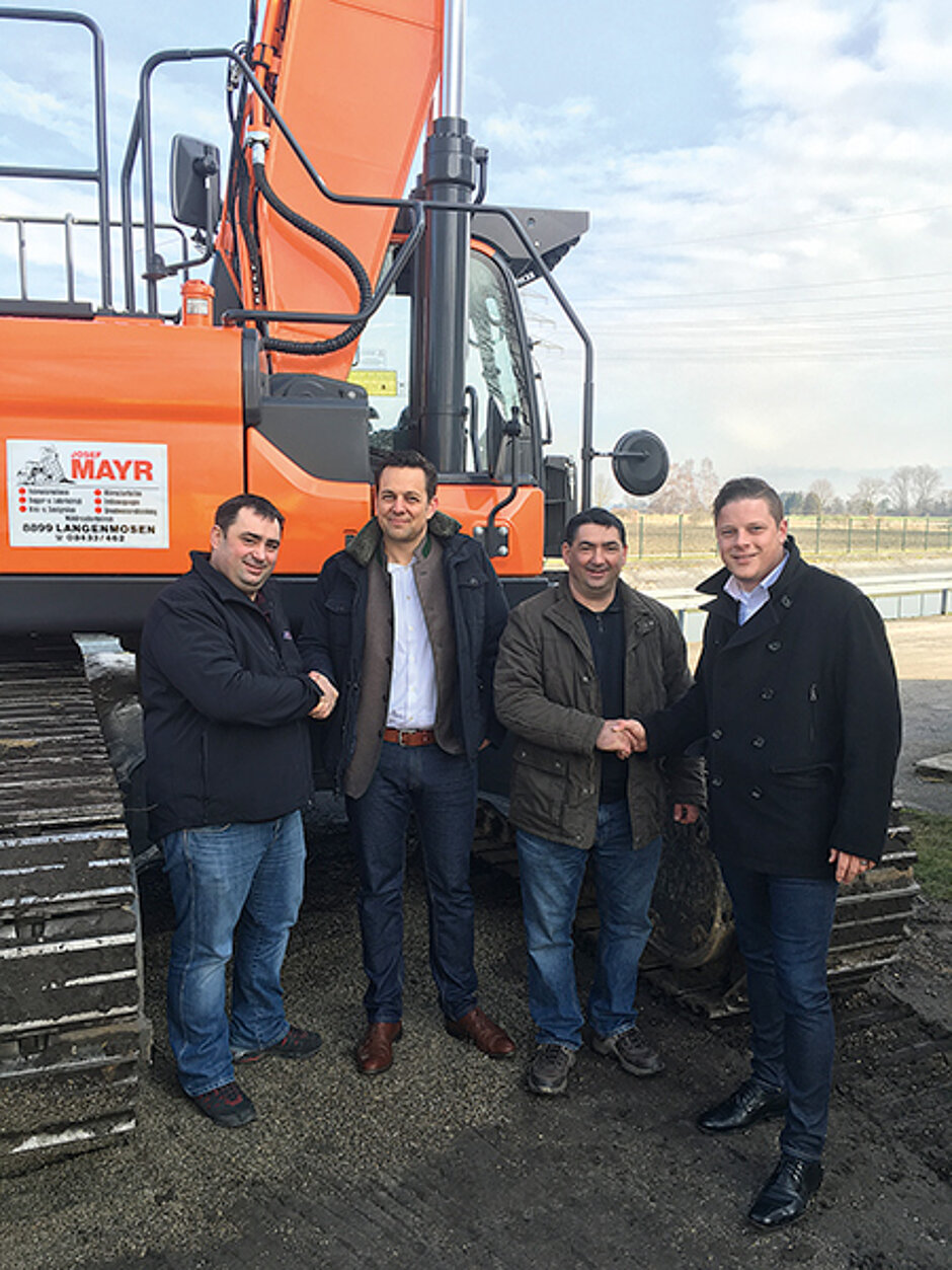 Im Arbeitsalltag bei Mayr sind für Erdbau- und Abbruchtätigkeiten zuverlässige Baumaschinen entscheidend. Die bisher mit der Doosan gemachten positiven Erfahrungen ebneten jetzt den Weg für weitere Investitionen. Im Unternehmen war man äußerst zufrieden mit dem Einsatz eines Radladers DL 550 im Steinbruch und eines knickgelenkten Muldenkippers DA 30. Die Bau-Niederlassung Ingolstadt und ihr Doosan-Vertriebspartner Thomas Landsperger erkannten das Potenzial des Kunden und überzeugten Josef Mayr sen. und dessen Söhne Siegfried und Thomas Mayr zum Kauf zweier weiterer neuen Doosan-Baumaschinen – ein Mobilbagger DX 190-3 und ein Kettenbagger DX 380-5. Neben der Streckung des Monoblockauslegers, der mit der Abbruchschere 14 m erreicht, verfügt der 39 t schwere Bagger über eine weitere Besonderheit: das 9 t schwere Heckgewicht kann hydraulisch entfernt werden, dadurch wird die Trägermaschine leichter und kann ohne Sondergenehmigung transportiert werden, was bei Mayr in Eigenregie auf zwei Zugmaschinen erfolgt. Dies führt zu einer optimierten Baustellenlogistik und Fuhrparkplanung.