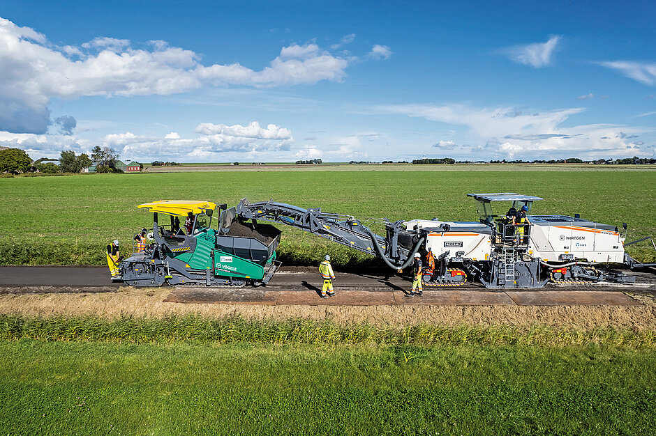 Granulieren, mischen und einbauen in einem Arbeitsgang: Der Kaltrecycling-Zug der Wirtgen Group hat einen Landwirtschaftsweg in den Niederlanden nachhaltig, effizient und ressourcenschonend saniert.