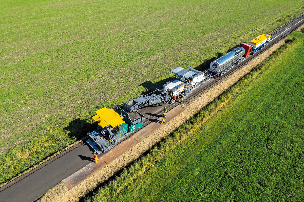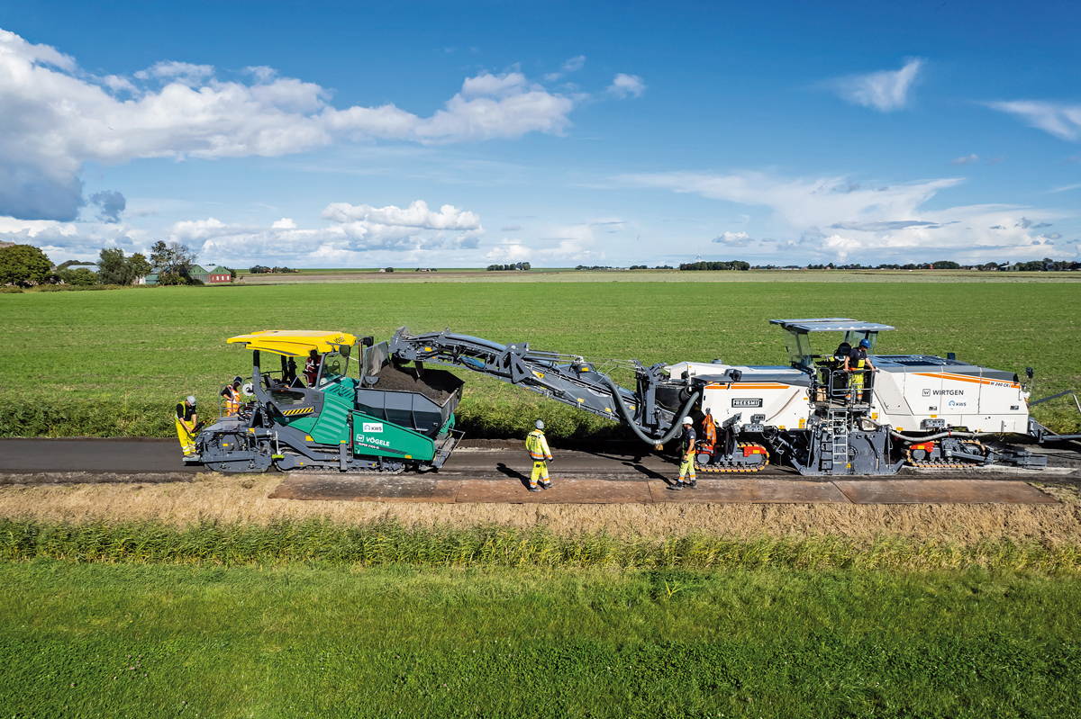 Mit dem Kaltrecycling-Zug der Wirtgen Group fräste das Einbauteam die vorhandene Asphaltschicht aus und bereitete das Material vor Ort, auch »in situ« oder »in-place« genannt, unter Beimischen von Bindemitteln und weiteren Zuschlagstoffen zu einer neuen BSM-Tragschicht (Bitumenstabilisiertes Material) auf. »Kaltrecycling in situ ist die Antwort auf die ökologischen und ökonomischen Anforderungen des modernen Straßenbaus«, sagt Raymond van de Stadt, Geschäftsführer Asphalt des Hauptauftragnehmers KWS. »In nur zwei Tagen haben wir die gesamte Strecke mit 100 % recyceltem Material erneuert und damit gegenüber herkömmlichen Verfahren eine Menge CO₂ und natürlich Zeit und Kosten gespart.«