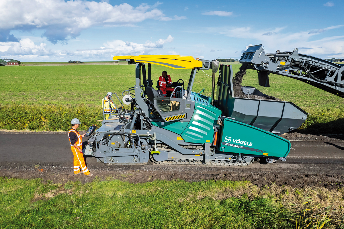 Auf der Baustelle in Ferwert fräste der Kaltrecycler das alte Straßenmaterial in einem Arbeitsgang 15 cm tief aus und bereitete das Material, unter Zugabe von Schaumbitumen mittels integrierter Vario-Einsprühleiste, im Mischraum zu homogenem BSM auf. Danach übergab der W 240 CRi das Material an den nachfolgenden Vögele Fertiger, der die 15 cm starke Tragschicht mit einer Geschwindigkeit von rund 4 m pro Minute einbaute. Nach Abschluss der Recyclingarbeiten versiegelte der Super 2100-5i die Tragschicht mit einer 4 cm dicken Asphalt-Deckschicht.