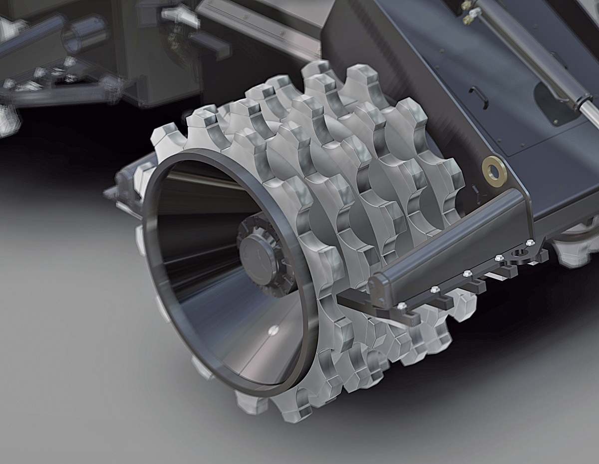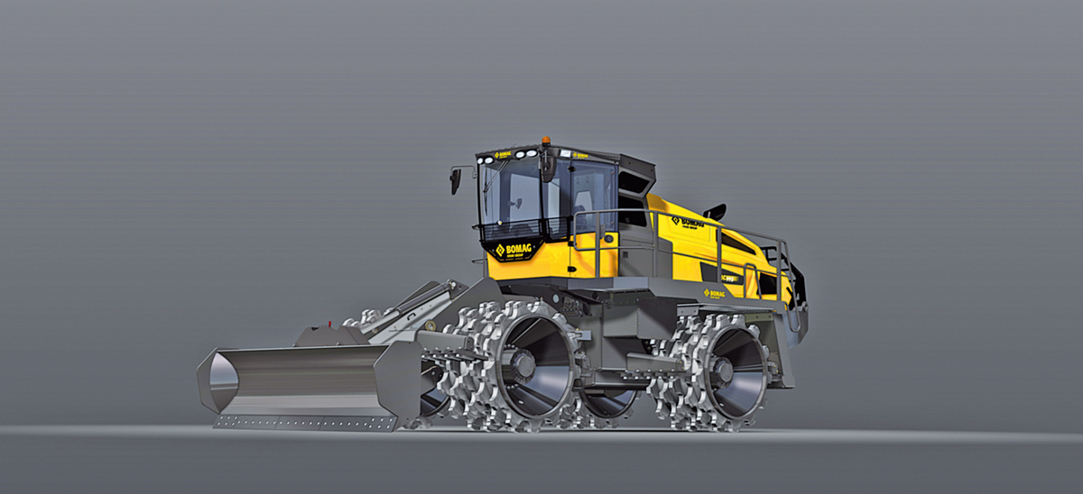 Das Bomag-Verdichtungskonzept basiert auf Rädern mit Zahnreihen und Abstreifern, um eine gleichbleibende Verdichtung und Traktion zu gewährleisten. Das Pendelknickgelenk unterstützt dabei eine optimale Lastverteilung auf die vier Räder. Dank Radversatz wird die Fläche komplett abgedeckt. Radlücken werden laut Bomag mit der zweiten Überfahrt somit vollständig geschlossen.