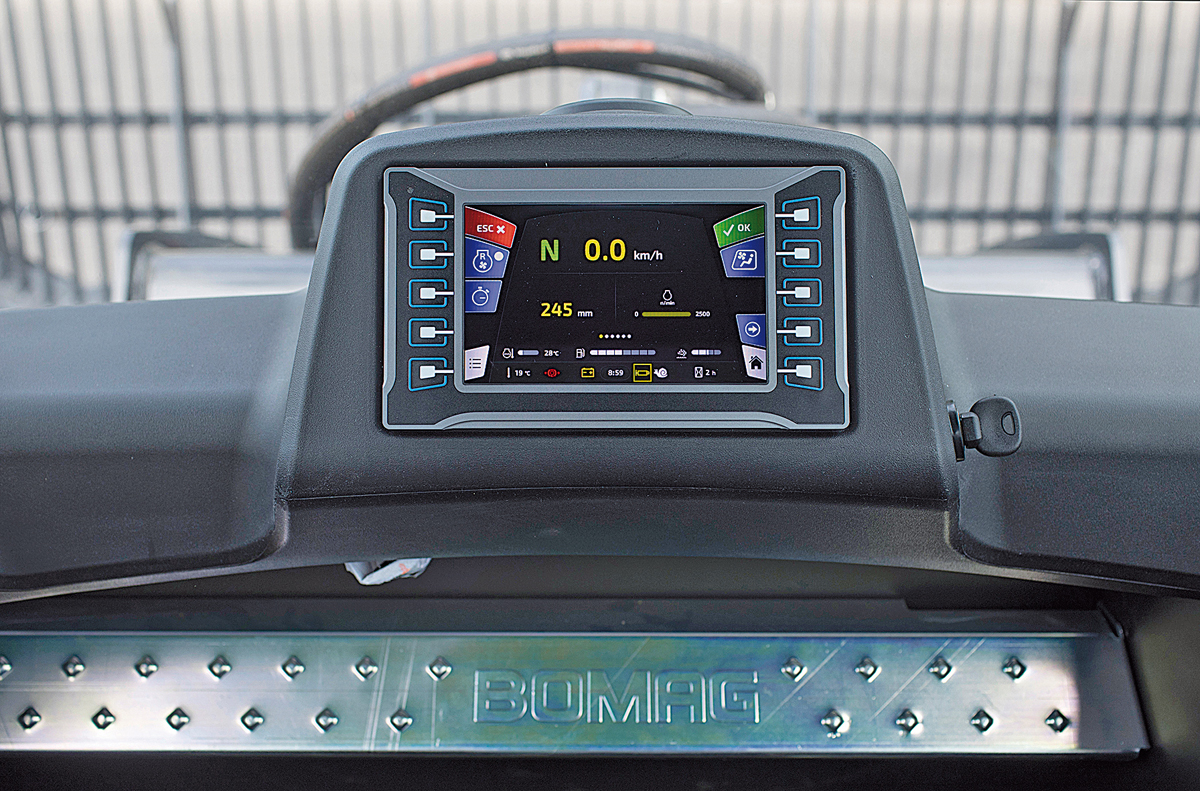 Die Handhabung von Erdverdichtern gilt als anspruchsvoll und soll mit dem neuen Bomag-Konzept von zukunftsweisenden Bedienlösungen profitieren. Der Fahrer des neuen Bomag-Erdverdichters soll die Maschine im wahrsten Sinne mit zwei Händen im Griff haben: Über Joysticks rechts und links kann der Fahrer die Funktionen der 456-PS-Maschine bedienen. Die Arme ruhen dabei auf den einstellbaren Armlehnen und die Hände schließen sich um die ergonomischen Multifunktionsfahrhebel. Ein Lenkrad hat der neue BC 773 EB-5 nicht mehr. Sein Motor erfüllt die Anforderungen der EU-Emissionsstufe V, Tier IV final.