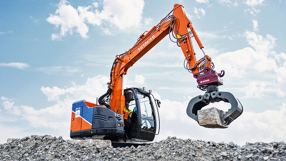 Der vollelektrische Kompaktbagger soll den konventionellen Dieselantrieben in nichts nachstehen müssen. Gerade wegen seines elektrischen Antriebs kann er auf den Punkt gar deutlich mehr Leistung liefern. Der ZE85 wurde für den Kiesel-Mietpark mit einem vollhydraulischen Schnellwechselsystem von OilQuick ausgestattet und nimmt so jegliche Art von Anbaugerät auf.
