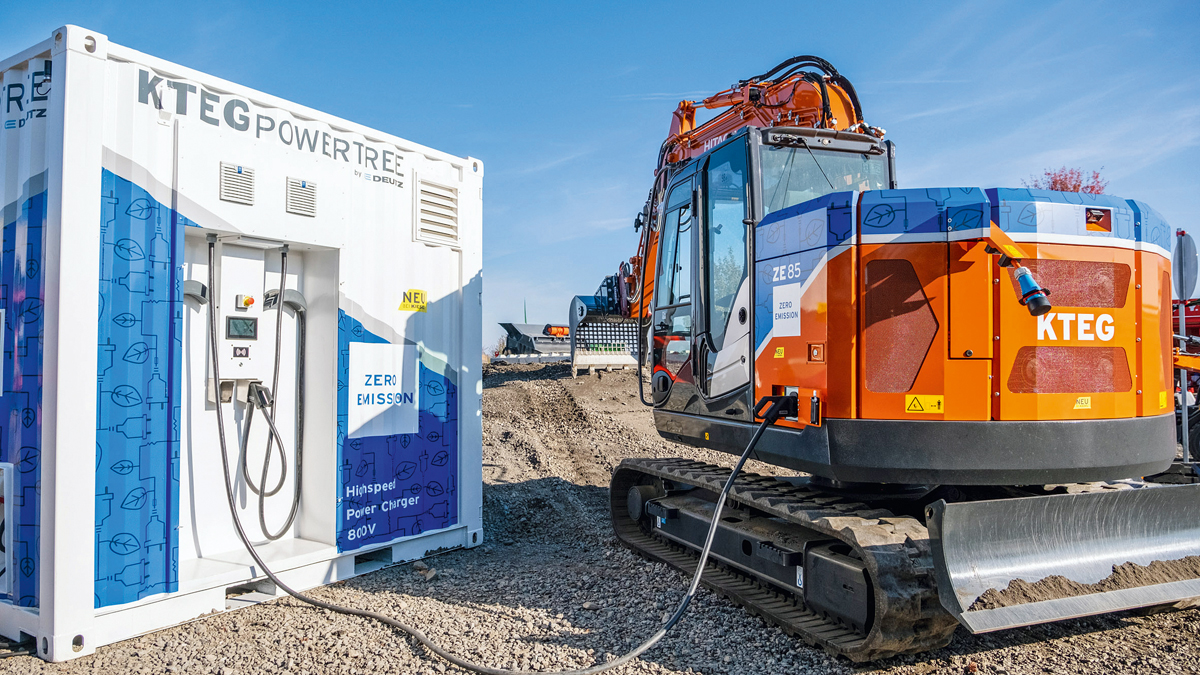 Die im Kiesel-Mietpark stehenden ortsmobilen Schnellladestationen KTEG-Powertree sind das Sahnehäubchen auf der klimaneutralen, emissionsfreien Baustelle. Den Powertree hatte der Sonderbaumaschinenhersteller konzipiert, um die Ladelogistik deutlich zu vereinfachen. Der Powertree kann, ohne geschultes Personal, binnen zehn Minuten an den Baustrom angeschlossen werden. Es steht eine 800-V-Ladetechnik bereit, die sowohl mit Gleich- und Wechselstrom als auch über eine CCS2-Schnittstelle laden kann.