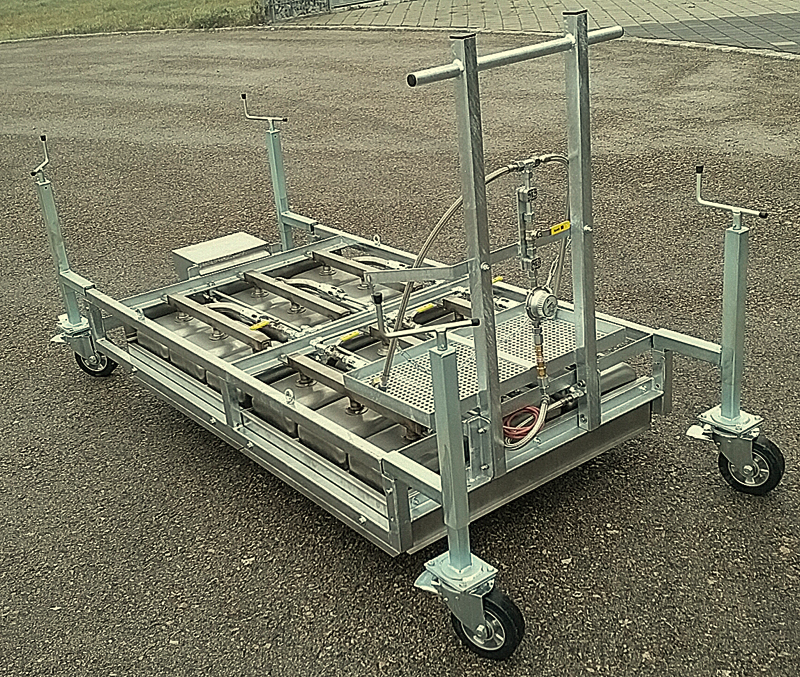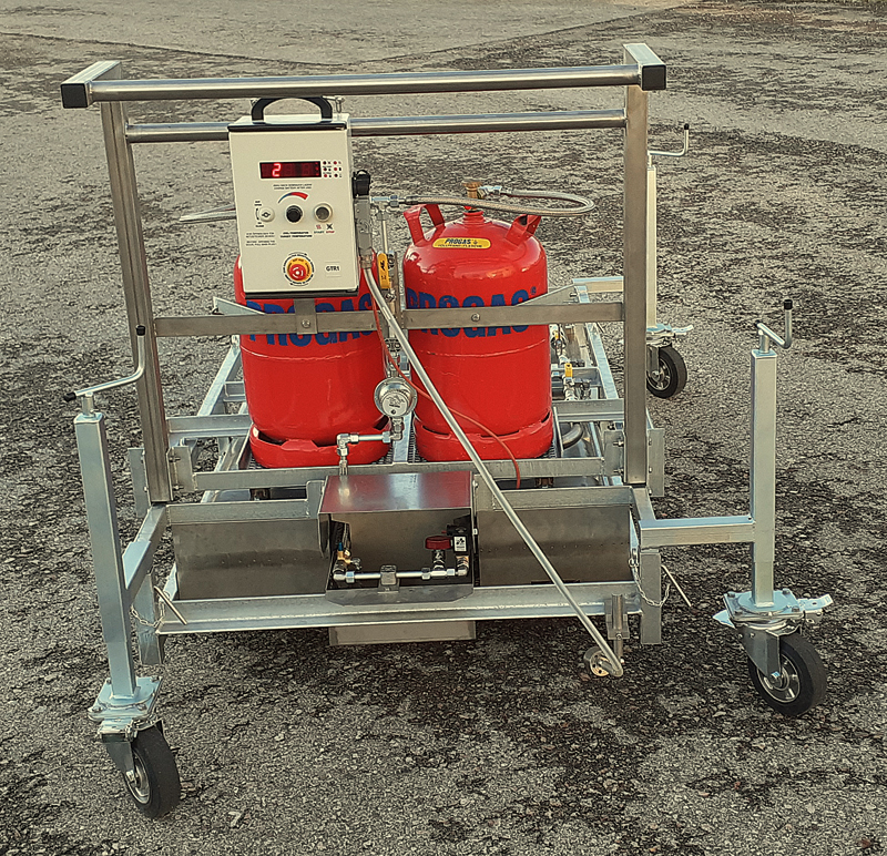 Um Gussasphalt, bituminöse Beläge oder Nahtverbindungen gut replastifizieren zu können, eignen sich sogenannte Nahtheizgeräte. Sie kommen beispielsweise zur Nachbehandlung von Unebenheiten und Nahtverbindungen sowie beim Einbau neuer Fahrbahndecken zum Einsatz, wenn zweibahnig eingebaut werden muss. Auch im Bereich der Kabelgrabenarbeiten eignen sich laut Kaemmerer zur gleichzeitigen Beheizung von zwei Nahtverbindungen etwa Nahtheizgeräte wie die Typen K-ST, ZB50 oder 25L. Die Heizung besteht hier aus Gasinfrarotstrahlern, die, in Längsreihe angeordnet, in einen Strahlerrahmen eingebaut sind. Die Abstandshöhe zwischen Strahlergitter und Straßenfläche ist zwischen 10 cm und 15 cm einstellbar. Damit die Anschlussnaht beim zweibahnigen Einbau kontinuierlich beheizt werden kann, lässt sich das Nahtheizgerät am Fertiger hinter der Bohle anbauen.
