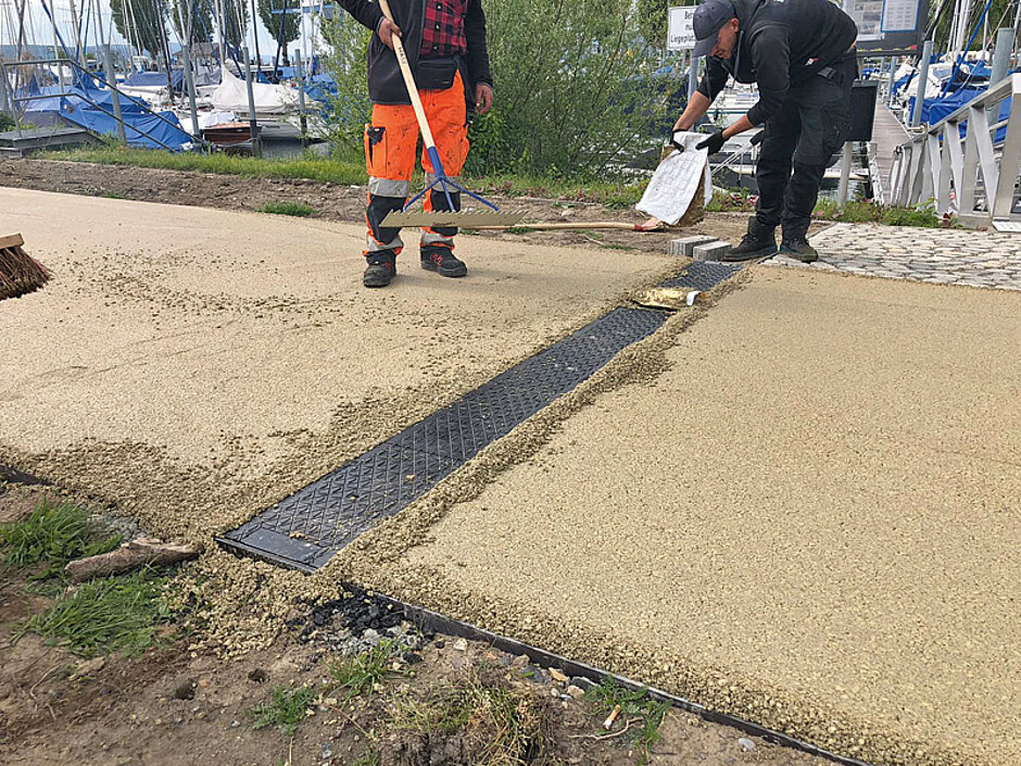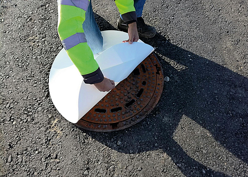 Dank der hohen Reißfestigkeit der Skap-Folien soll das Überfahren mit Lkw und Maschinen nach dem Aufkleben kein Problem darstellen. Eigentlich habe man nur Folien für Kanalschächte anbieten wollen, so Patrik Waibel, daraus wurde durch Kundenanfragen schnell ein Portfolio für Kanal- und Einlaufschächte, Schieber und Rinne. tü t