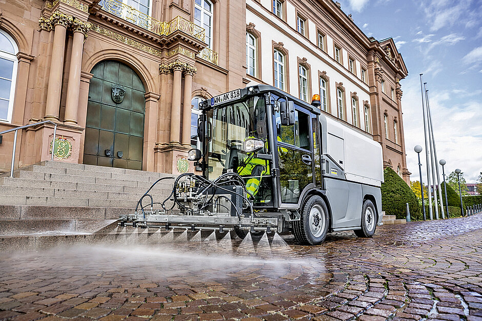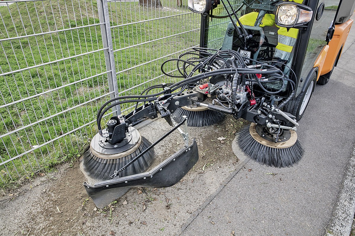 Die Nassreinigung mit Bürstentechnologie wird im Außenbereich zunehmend wichtiger. Teilweise geht es sogar darum, hochwertige Straßenbeläge vor dem Ergrauen zu schützen und nachhaltig zu pflegen. Während in der Innenreinigung entweder Scheiben- oder Walzenbürsten zum Einsatz kommen, sind in der Außenreinigung meist Tellerbürsten im Einsatz. Aufgrund der Wendigkeit und Transportgeschwindigkeit wie auch wegen der gegebenen Bodenfreiheit und des teilweise verfügbaren Allradantriebs bieten Kommunalmaschinen im innerstädtischen Bereich große Vorteile hinsichtlich der Flexibilität, schnellen Verfügbarkeit und Anwendungsvielfalt gegenüber größeren, industriell ausgelegten Geräten. Grundlegend sollte der Fuhrpark sorgfältig ausgewählt werden: Die Maschinen sollten kehren und nass reinigen können sowie den Wechsel zwischen Anbaugeräten ermöglichen.