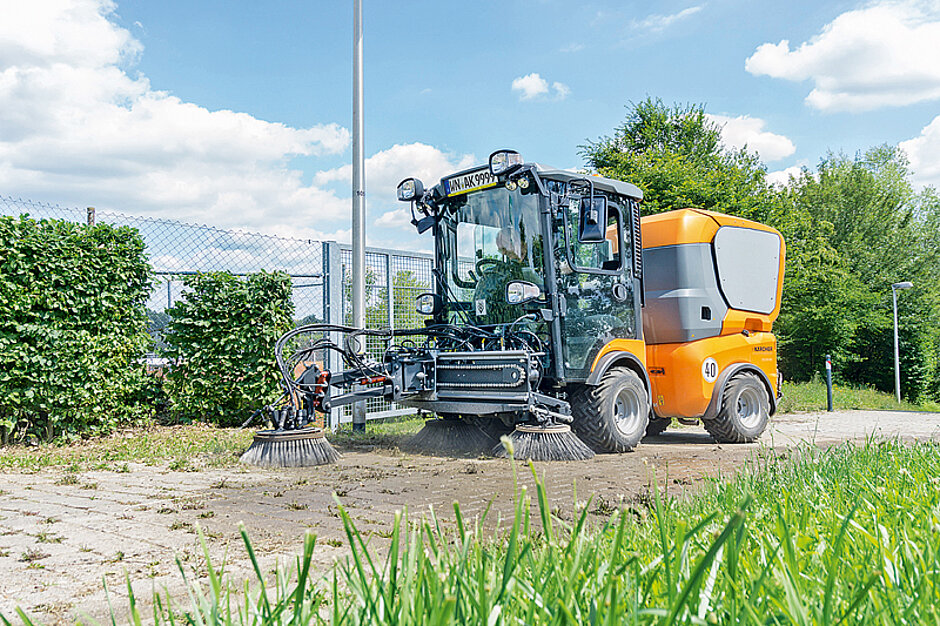 Der Arm des dritten Seitenbesens ist an einer Laufschiene an der Vorderseite des Fahrzeugs angebracht, auf der der Besen hin und her fahren kann. Mit dem Querverschub ist die flächige Wildkrautentfernung über eine Breite von 1 600 mm hinweg möglich – beispielsweise auf Geh- und Radwegen oder Zugängen zu Wohn- und Parkanlagen. Im selben Arbeitsgang wird der Grünabfall über die Absaugung in den Kehrgutbehälter aufgenommen. Für die Entfernung von besonders hartnäckigem Unkraut lässt sich der Anpressdruck des dritten Besens über die Fahrzeughydraulik einstellen. Bislang wurde Druck nur durch das Eigengewicht des Besenkopfes erzeugt.