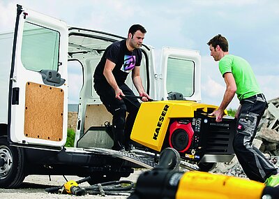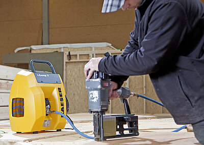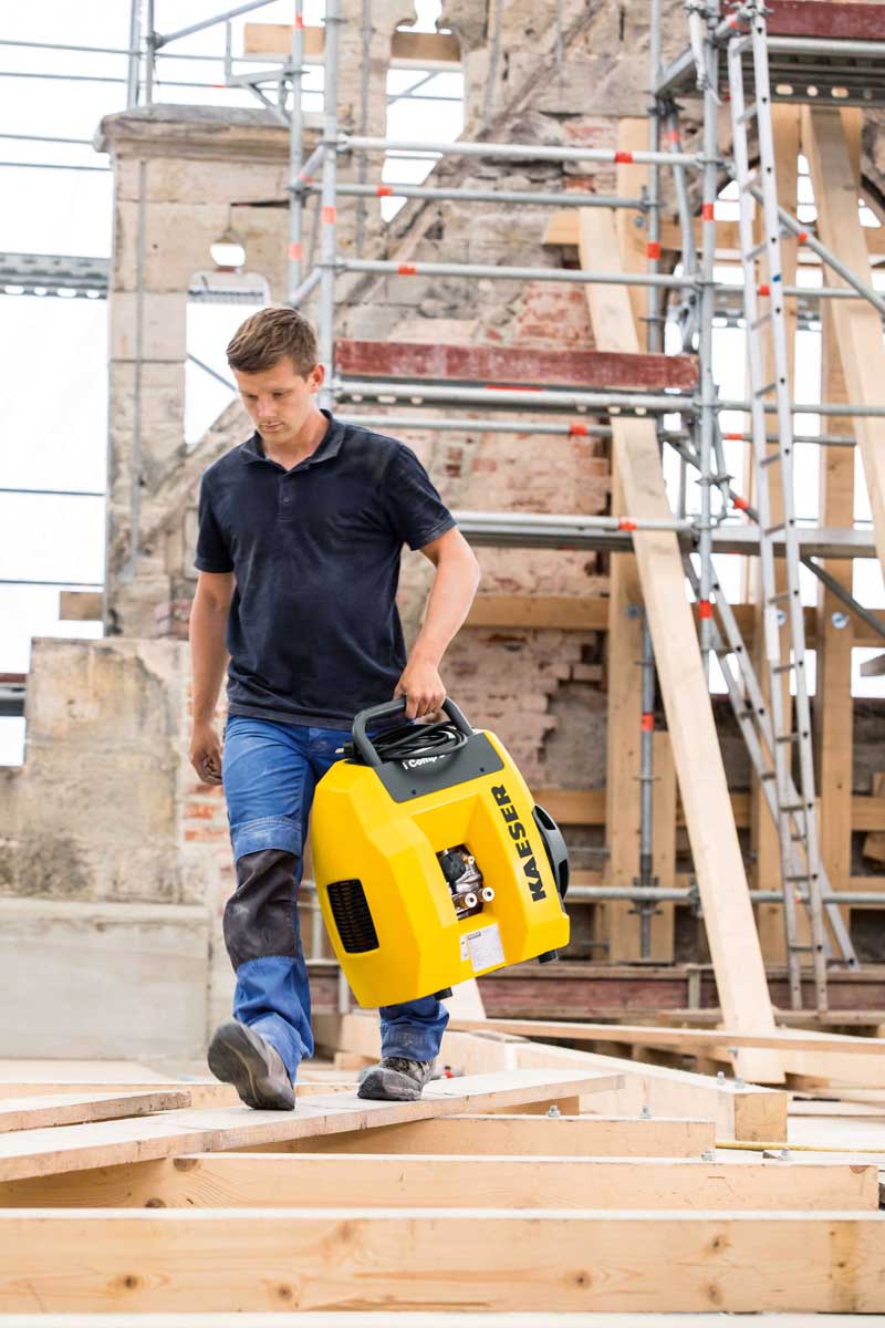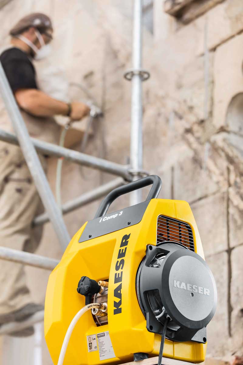 Der innovative Handwerkerkompressor – i.Comp 3: Er ist robust, leistungsstark, kompakt, handlich, wartungsfreundlich und effizient – der neue i.Comp ist ein tragbarer, stufenlos drehzahlregelbarer Kolbenkompressor in gewohnt industrietauglicher Kaeser-Qualität, der zu 100 Prozent Made in Germany ist und überall hin mitgenommen werden kann. Der ölfrei verdichtende Handwerkskompressor ist dauerlauffähig und hat dank seines drehzahlgeregelten Motors einen ausgezeichneten Wirkungsgrad. Ein Druckluftbehälter ist nicht nötig. Die bewährte Kaeser-Steuerung ermöglicht eine Druckvorwahl und stufenlose Drehzahlvariationen. Selbst bei einer Kabellänge von 150 Metern läuft er spielend leicht an und liefert konstanten Druck bis zu 11 bar bei absoluter Betriebssicherheit.