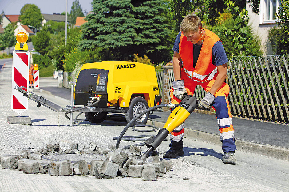 Der Mobilair M20 will beweisen, dass Leistungsstärke nicht an ein hohes Gewicht gekoppelt sein muss. Mit einer Liefermenge von 2 m³/min bei 7 bar soll er über genügend Reserve zum Antrieb eines schweren Drucklufthammers verfügen und gleichzeitig nicht einmal 460 kg auf die Waage bringen. Diese Eigenschaften verdankt er seiner Konstruktion, einem energiesparenden Schraubenkompressorblock mit strömungstechnisch optimiertem »Sigma Profil«, einem Übertragungsverluste vermeidenden 1:1-Antrieb und einem wassergekühlten Dreizylinder-Dieselmotor von Kubota. Dieser erfüllt ohne Dieselpartikelfilter und ohne Adblue die geforderten Abgaswerte der EU-Stufe V.