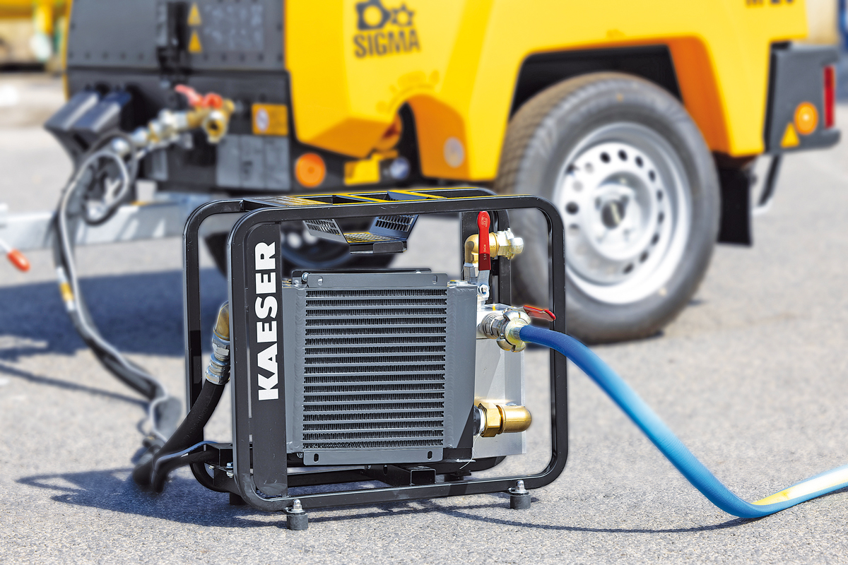Wird kühle und kondensatfreie Druckluft benötigt, wird lediglich der optional erhältliche Nachkühler angeschlossen. Er ist in ein Tragegestell eingebaut und verfügt über drei fest montierte Leitungen für Druckluft, Kondensatrückführung und elektrischen Strom (12-V-Spannung, geliefert vom Kompressor) zum Antrieb des Nachkühlerlüfters. Das bei der Abkühlung anfallende Kondensat tropft nicht auf den Boden, sondern wird in die Anlage geleitet und mithilfe der heißen Motorabgase verdampft. Die ebenfalls zur Ausstattung gehörende Bodenwanne schützt vor Bodenverunreinigungen.