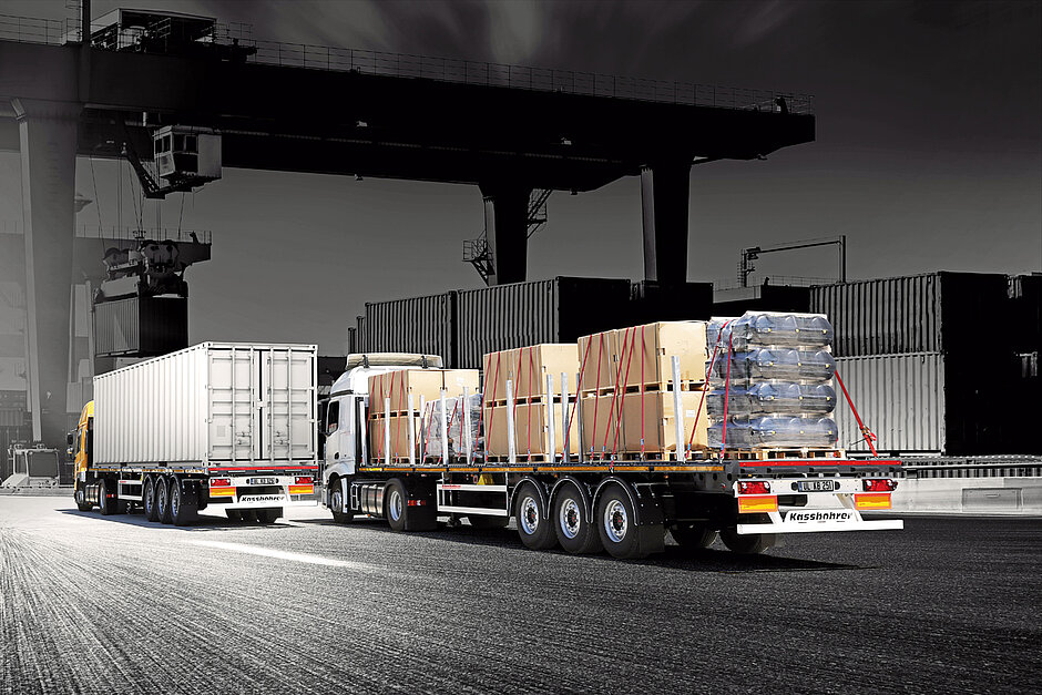 Der Kässbohrer Plattformsattelauflieger K.SPS XS ist so konstruiert, dass er bei einem minimalen Eigengewicht von 5,8 t die höchste Nutzlastkapazität bietet, ohne durch das robuste Fahrgestells mit KTL-Beschichtung Kompromisse bei der Leistung einzugehen.