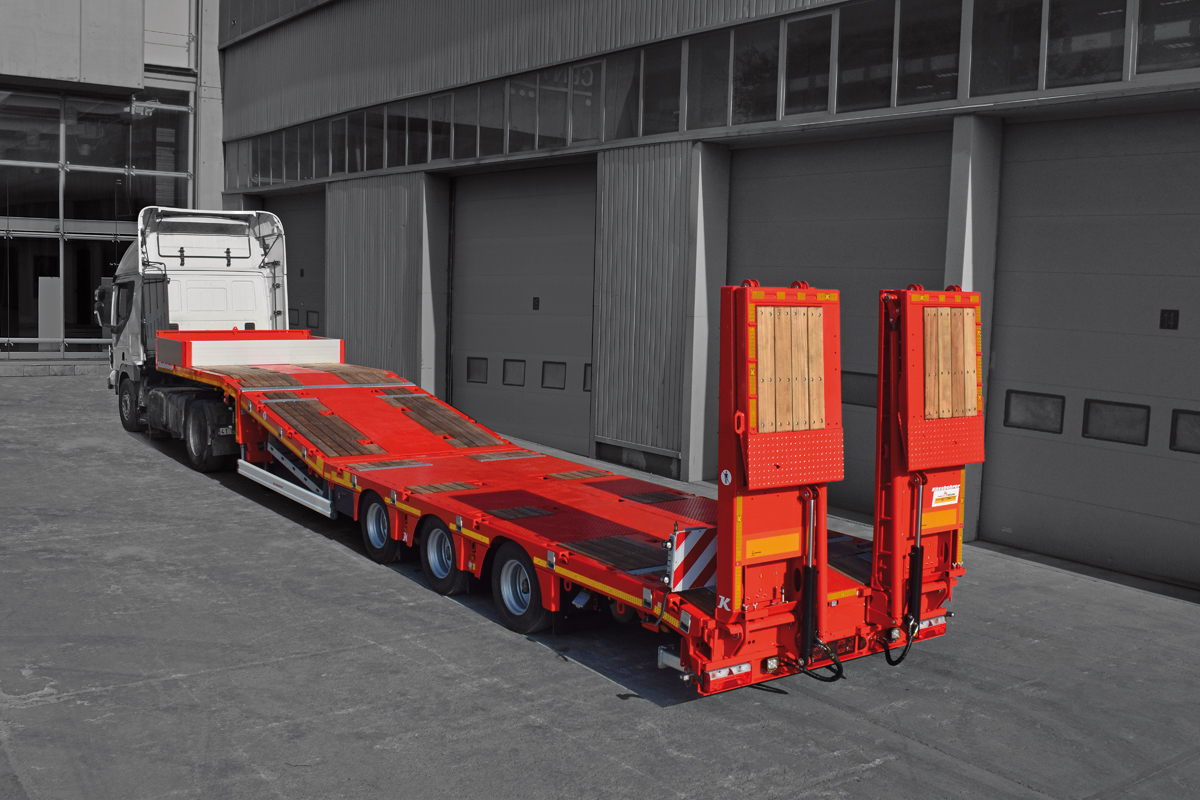 Das SLA HS, ein ausziehbares Tiefbett mit hydraulischer Schwanenhals-Auffahrrampe, gewährleistet Effizienz und Flexibilität für den vielseitigen Transportbedarf im Straßenbau. Mit seiner hydraulischen Schwanenhalsauffahrrampe kann er zwei Arbeitsmaschinen in einem Arbeitsgang transportieren. Während die hydraulische Schwanenhalsauffahrrampe für einen effizienten Betrieb sorgt, ermöglichen 10-t-Zurrringe, Containerverriegelungen, vertikale und seitliche Rungentaschen eine einfache und sichere Ladungssicherung.