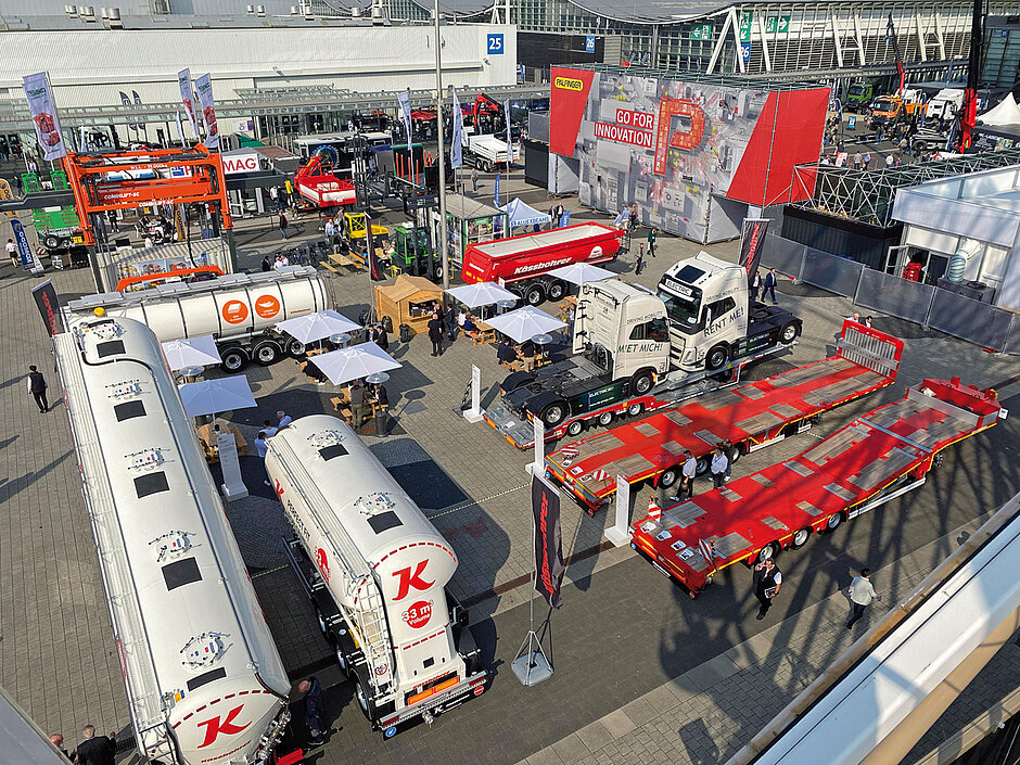 Ebenso konnten Besucher den dreiachsigen, ausziehbaren Plattform-Auflieger mit Radmulden, den »K.SPA MR 3«, genauer unter die Lupe nehmen. Dieser ermöglicht mit seinem robusten Chassis aus S700MC-Stahl den sicheren Transport langer, schwerer Lasten. Mit einer Höhe von nur 620 mm in den Radmulden ermöglicht er den Transport besonders hoher Ladung. Das um bis zu 6 900 mm ausziehbare Chassis sowie Schiebeplattform-Funktionen sorgen für Flexibilität im Einsatz. Um Ladung bestmöglich zu sichern, bietet der »K.SPA MR 3« zahlreiche Ladungs-Befestigungspunkte: Zurrringe mit 5 bis 10 tKapazität, 4×2 Reihen vertikale Rungentaschen sowie Rungentaschen an den Seiten. Zudem kann das Fahrzeug mit einer großen Palette an Optionen ausgestattet werden: Lift-Achse, Verzinkung, Heck- und Schwanenhals-Rampen.