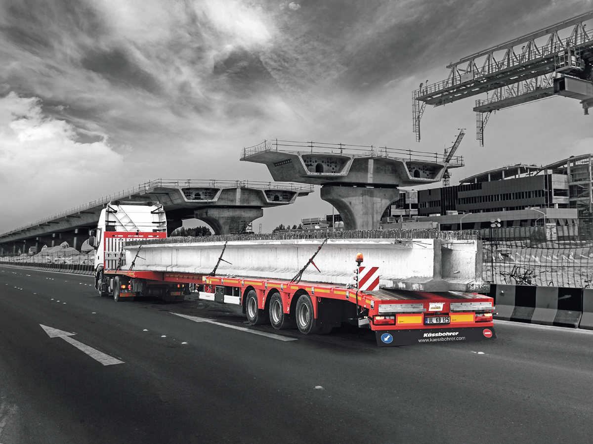 Die Kässbohrer-Schwerlast-Plattformen sind speziell für den Transport von langen, schweren und übergroßen Ladungen wie Betonblöcken, Brückenteilen und Stahlkonstruktionen entwickelt worden. Die durchdachte Konstruktion der bis zu 3 500 oder 6 900 mm ausziehbaren Plattform mit Verriegelungspositionen im Abstand von