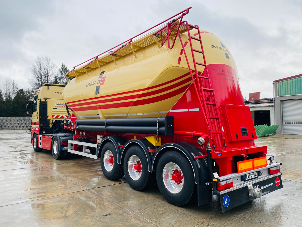 Firmeninhaber Florian Spengler hatte das Fahrzeug am Kässbohrer-Standort Ulm von Michael Conrad, bei Kässbohrer Vertriebsleiter für das Segment Tank & Silo, übernommen. »Das liegende Silo K.SSL 35 von Kässbohrer ist mit seiner Qualität, der effizienten Entleerung, der sehr guten Manövrierfähigkeit, der hohen Stabilität und der Tragfähigkeit die richtige Wahl zur eigenen Belieferung unseres Betonwerks mit Zement«, betonte Spengler. Das kompetente Kässbohrer-Servicenetz in Deutschland und Europa, die schnelle Verfügbarkeit von Ersatzteilen und die Qualität des Kundendienstes seien für das Haus Spengler ebenfalls wichtig. »Neben der Garantie und Sicherheit bietet Kässbohrer auch günstige Finanzierungslösungen an«, so Spengler weiter.